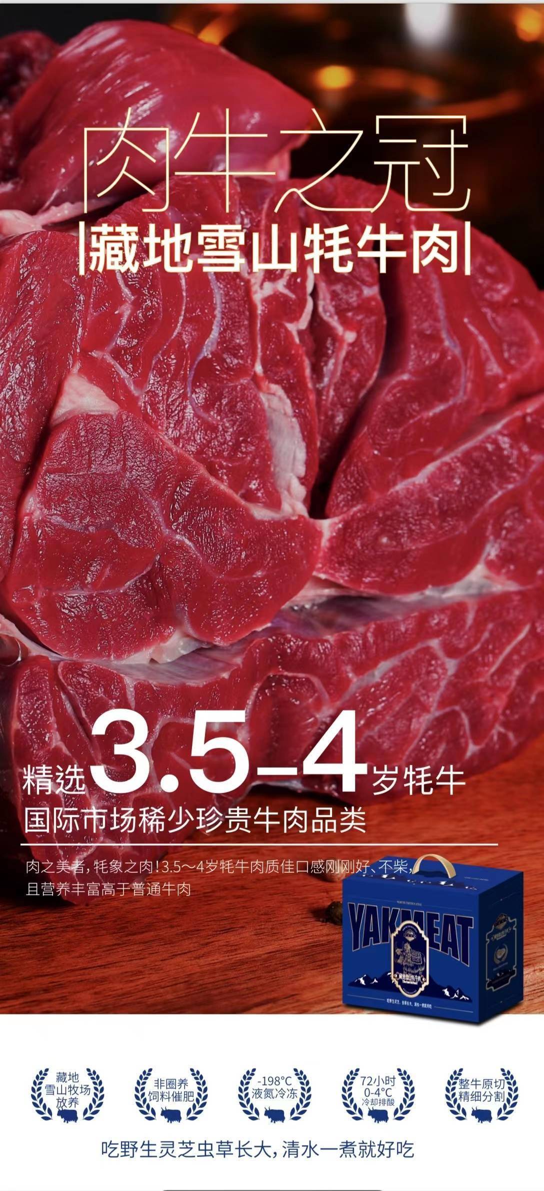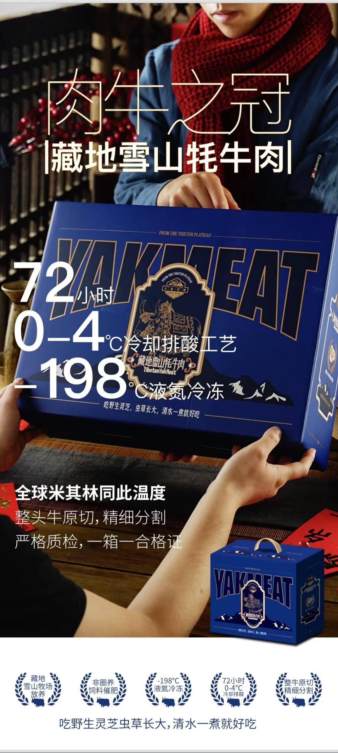 【产品名称】肉牛之冠 | 藏地雪山牦牛 【产品类型】初级农产品 【产品产地】四川省阿坝藏族羌族自治州红原县 【产品规格】 2斤装(家庭体验装) 3斤装(人气高钙汤骨组合) 5斤装(家庭实惠装) 6斤装(家庭实惠装) 3斤装(家庭实惠装) 5斤装(臻享礼盒) 6.5斤装(至尊礼盒) 【产品包装】礼盒外箱+泡沫箱+保温袋+冰袋 【储存方式】-18℃密封冷冻保存 【保质日期】冷冻保存365天 【发货时效】下单48-72小时发货