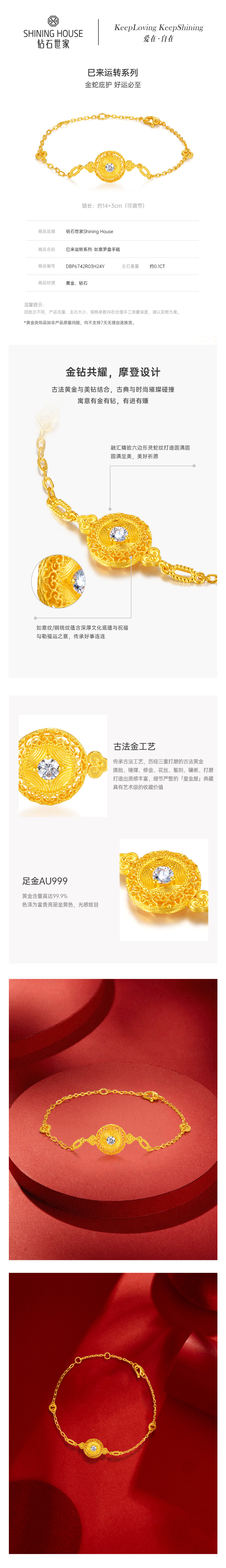 【巳来运转系列】钻石世家 如意罗盘手链 足金手链 以象征财运富贵长寿的灵蛇纹融入吉祥元素,黄金与闪耀钻石的时尚设计蕴藏金蛇庇护,蛇来运转的巧思【黄金产品不支持无理由退换货】预计3-5天发货