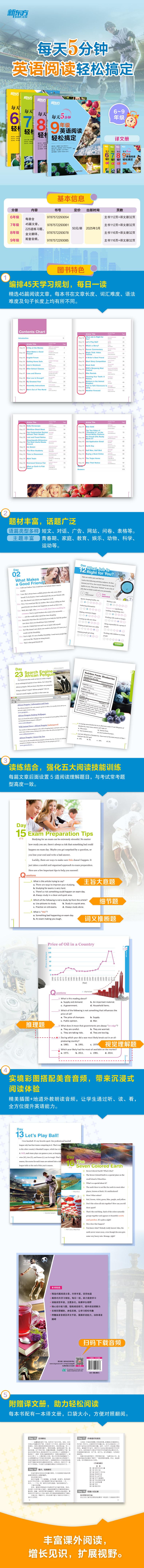新课改后,英语阅读的重要性显著提升。而且,新版英语教材不仅增加了阅读语篇数量,还丰富了语篇类型,引导学生在真实情境中学习语言。 为此,我们引进了“每天5分钟 6~9年级英语阅读轻松搞定”系列图书。该系列图书所选文章贴近学生生活,让学生在真实语境中提升阅读能力。每篇文章后配有主旨大意题、细节题、词义推断题、推理题和视觉理解题等常考题型,帮助学生提高阅读理解能力。本书还编排了45天学习规划,每天阅读1篇文章,仅需5分钟,学习无压力,助力学生逐步提升英语阅读能力!