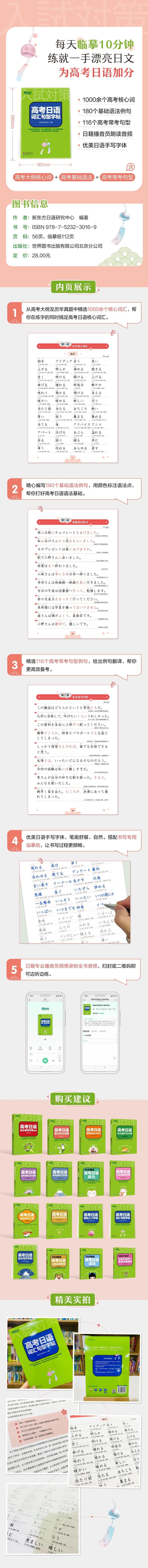 《高考日语词汇句型字帖》是一本为参加高考日语的考生练习书写高考核心词汇和语法句型而编写的字帖。本书共分为三章,第一章为高考核心词汇的练习,书中基于高考日语大纲及历年高考日语真题,精选1000余个高考日语核心词汇,并给出发音、音调、词性和释义等;第二章为高考日语基础语法知识相关的句子练习,书中精心编写180个例句,标注句中的语法知识点,并给出句子翻译;第三章为高考常考句型的句子练习,此部分精选了116个历年真题中常考的句型,并给出例句和翻译。