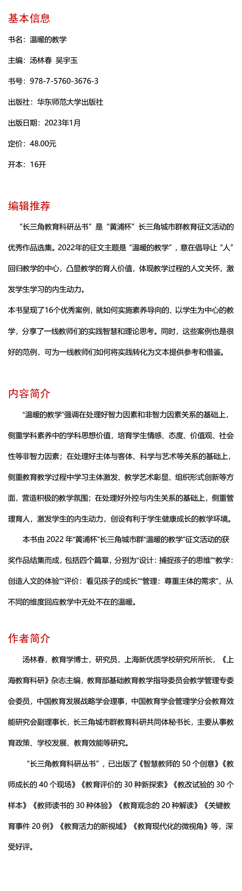 “温暖的教学”强调在处理好智力因素和非智力因素关系的基础上,侧重学科素养中的学科思想价值,培育学生情感、态度、价值观、社会性等非智力因素;在处理好主体与客体、科学与艺术等关系的基础上,侧重教育教学过程中学习主体激发、教学艺术彰显、组织形式创新等方面,营造积极的教学氛围;在处理好外控与内生关系的基础上,侧重管理育人,激发学生的内生动力,创设有利于学生健康成长的教学环境。本书由2022年“黄浦杯”长三角城市群“温暖的教学”征文活动的获奖作品结集而成,包括四个篇章,分别为“设计:捕捉孩子的思维”“教学:创造人文的体验”“评价:看见孩子的成长”“管理:尊重主体的需求”,从不同的维度回应教学中无处不在的温暖。