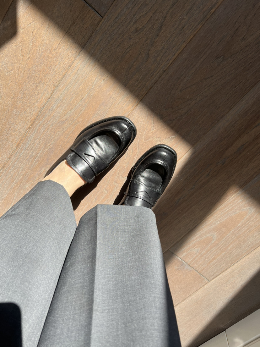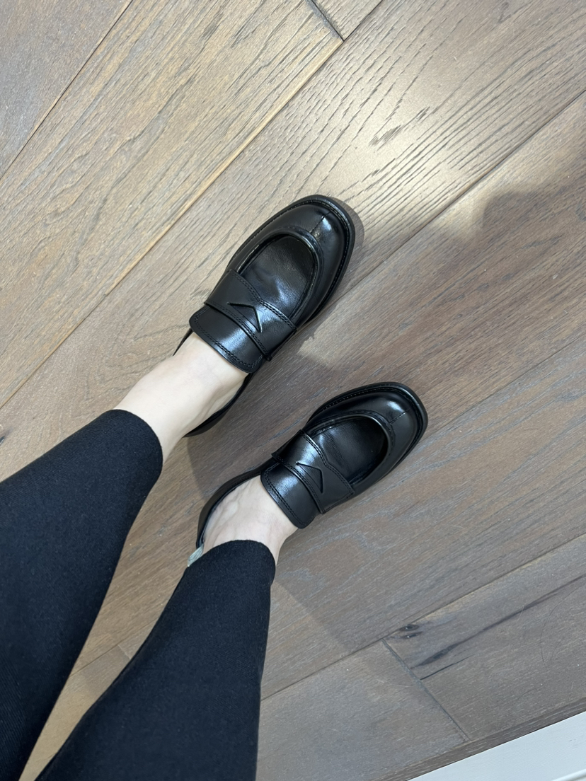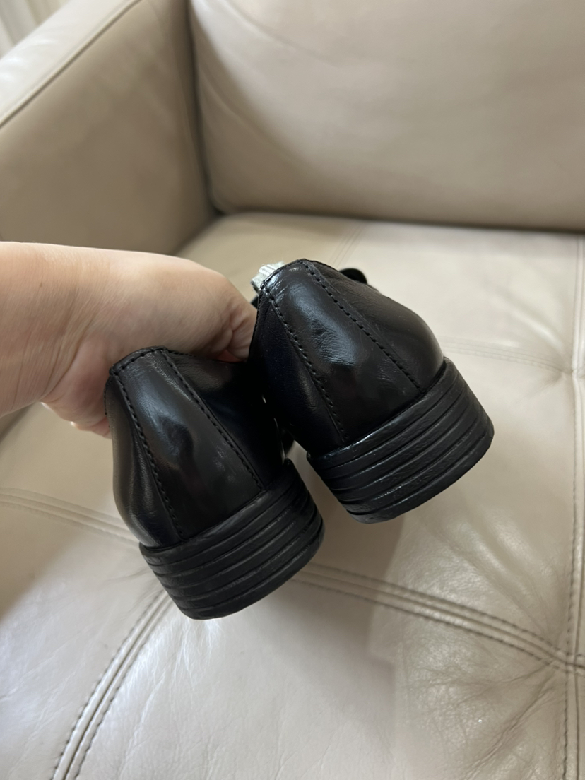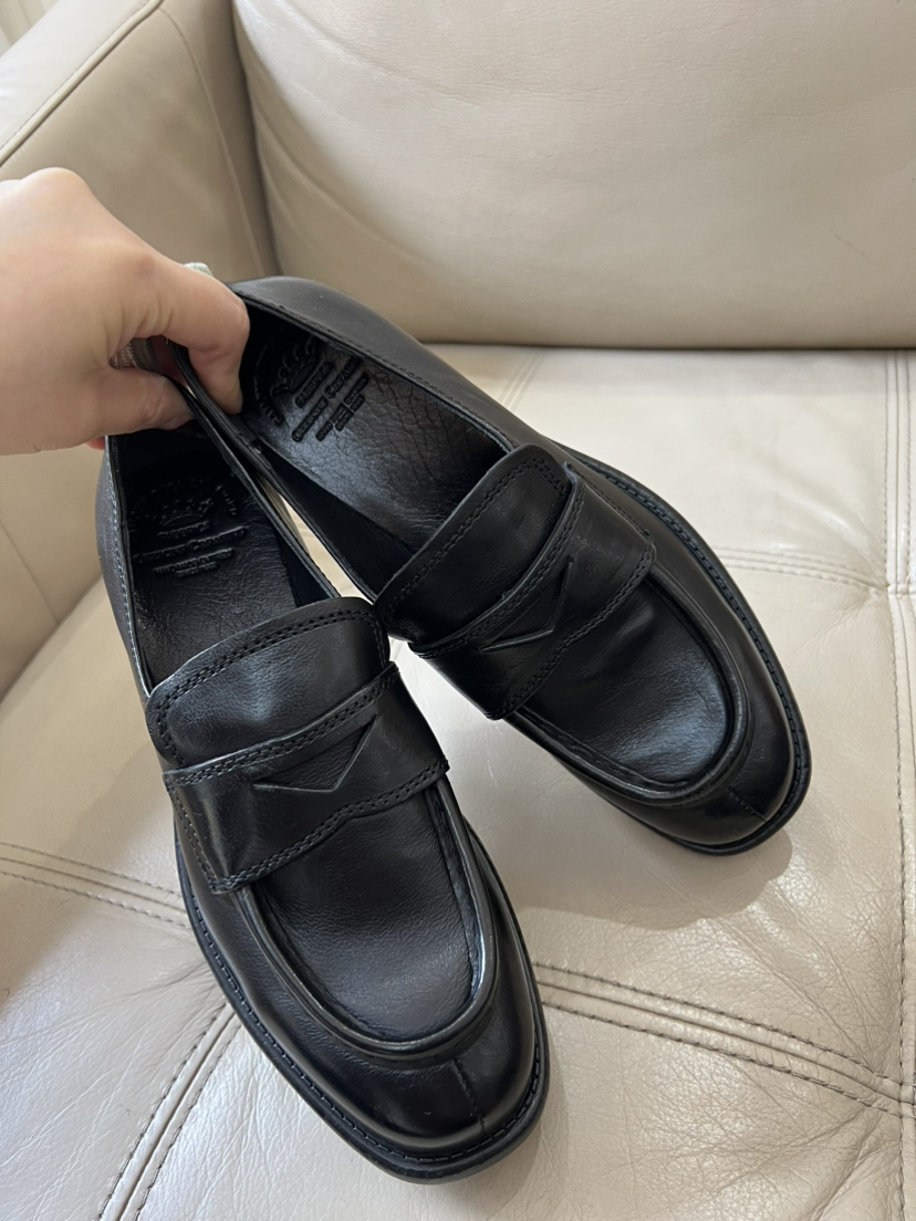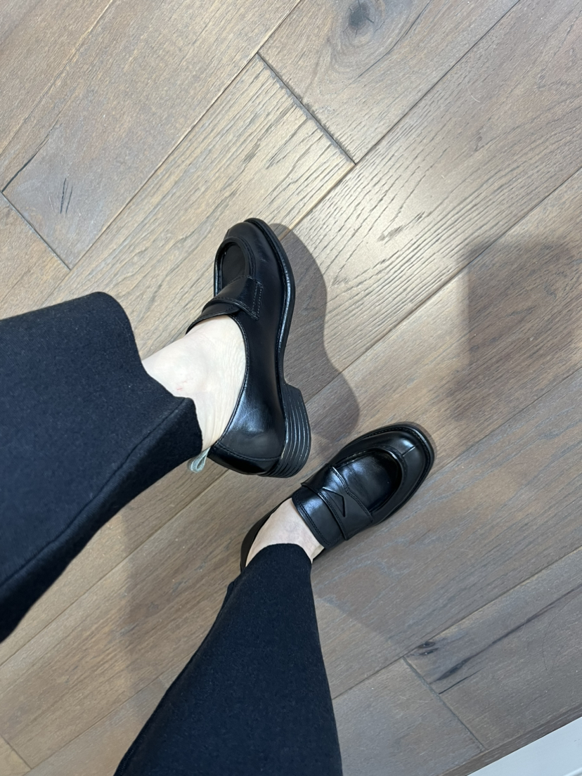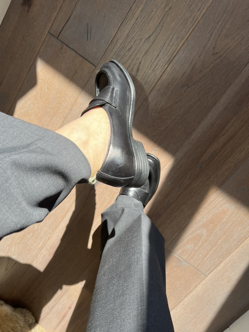 鞋头略方,鞋型修长,鞋舌下面有松紧带,非常跟脚,完全不勒,原始质感的皮质,拙朴大气。看着秀气的鞋型,穿进去宽裕且贴合脚型,橡胶防滑耐磨大底,3cm跟高,跟脚好走,肥脚无惧,