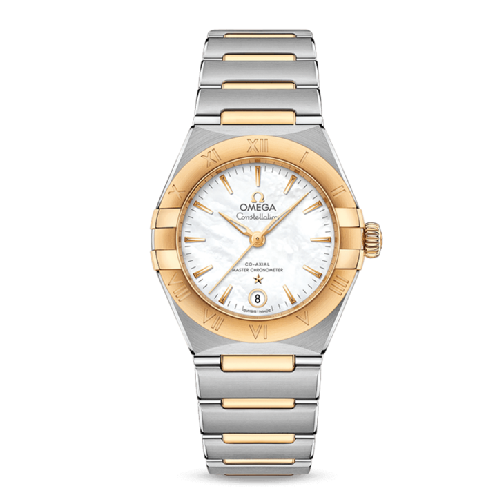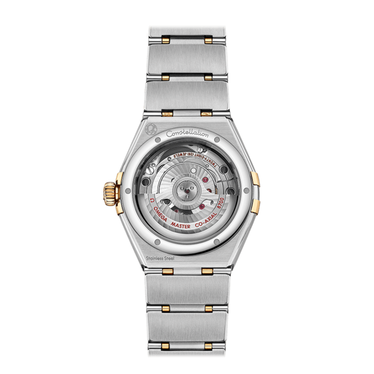 镜面材质 | 蓝宝石水晶玻璃 | 表盘 | 精钢黄色18K金与精钢表圈,星座系列特有的“托爪”设计。 黄色18K金与精钢打造,表圈镌刻罗马数字刻度,珍珠母贝表盘珠光闪耀,6点钟位置设有日历窗口。指针、欧米茄品牌标识、星座徽标以及小时刻度亦以黄色18K金打造而成。 透底 |