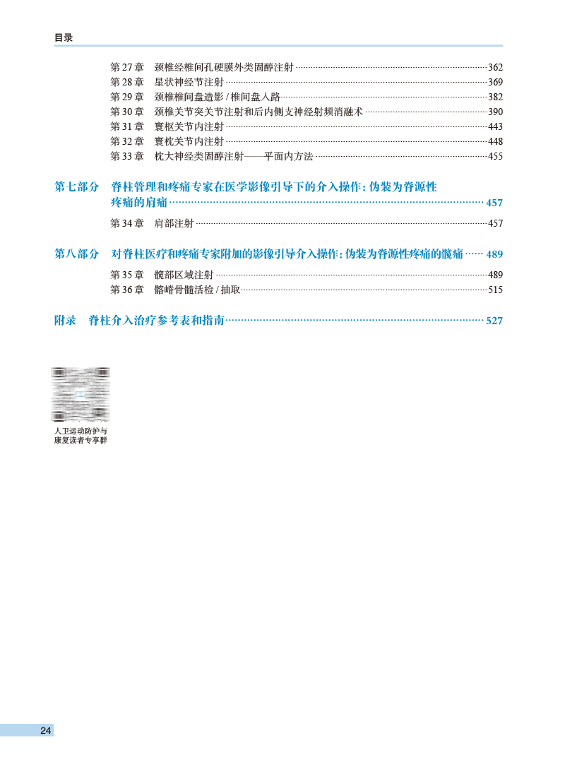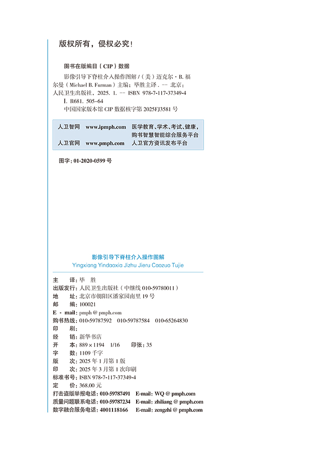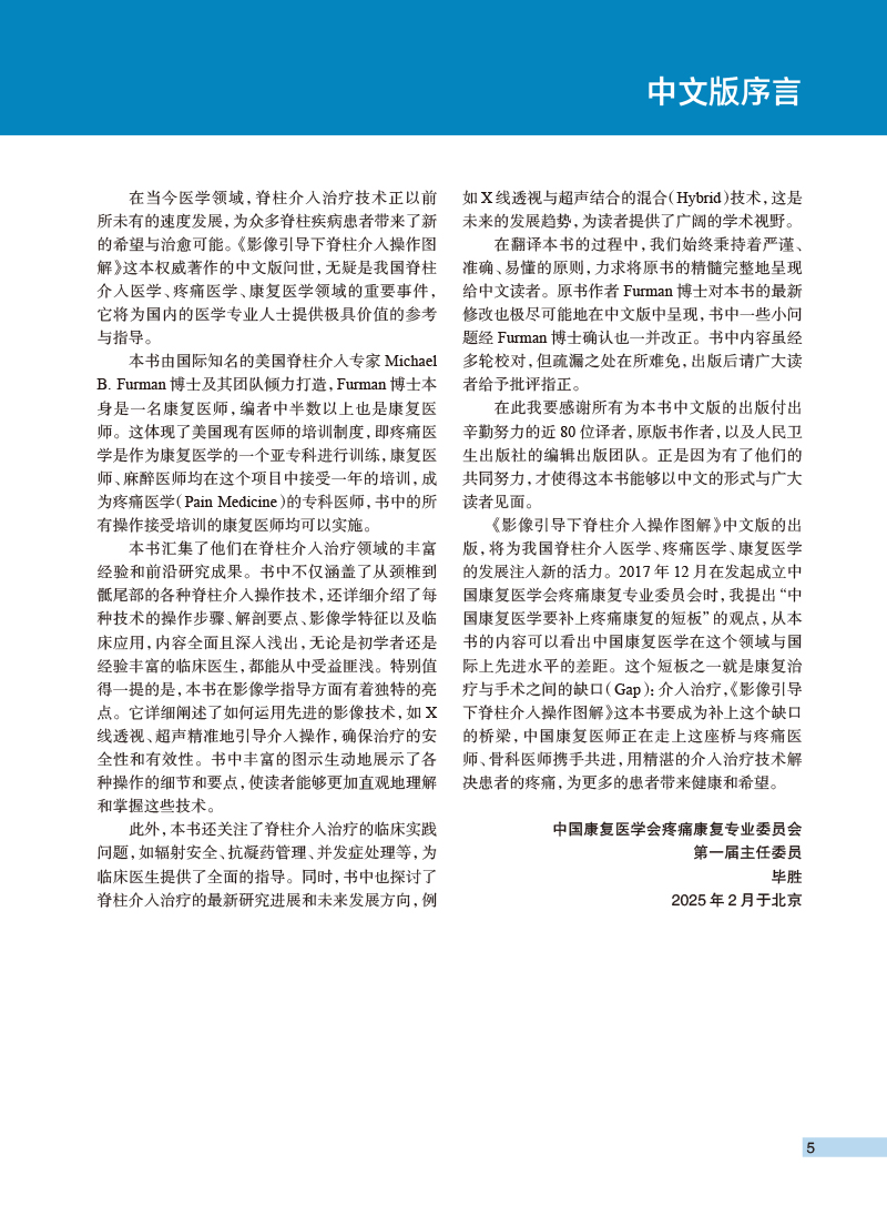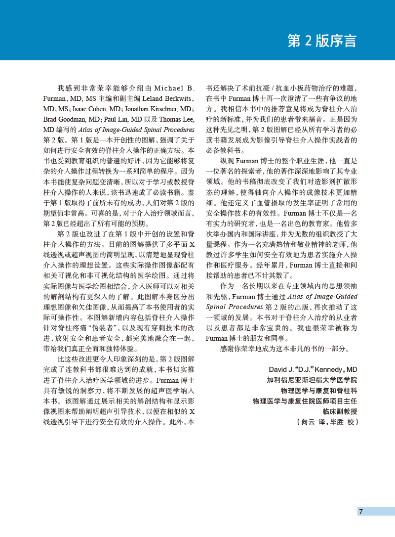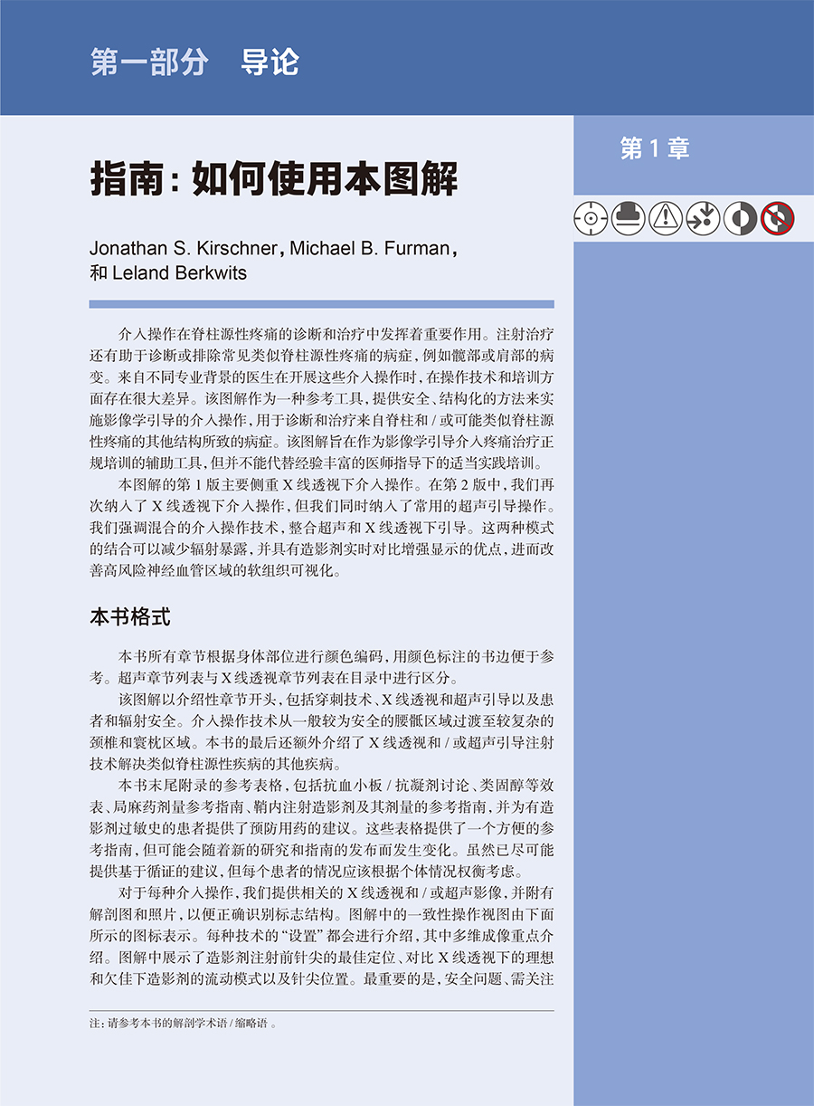 该书的特色是实用性,以图为主,文字简明扼要。并把介入程序每步以图和文字结合说明,让使用者按图学习提高。同时,第二版比第一版增加1倍内容,加入各位作者的新经验,保证书的学术先进性。 影像引导的脊柱介入技术是目前欧美康复医师和疼痛医师的主要治疗手段,虽然国内也有类似书籍引进翻译,但远远满足不了临床的需要。目前中国有2万名康复医师,2万名疼痛医师,需要正规的培训才能够更好的为患者服务。该书是目前美国这个领域优秀的专著之一,经过多名美国同行推荐,故选择此书。该书的作者Michael Bruce Furman也认可主译的团队翻译这本书。