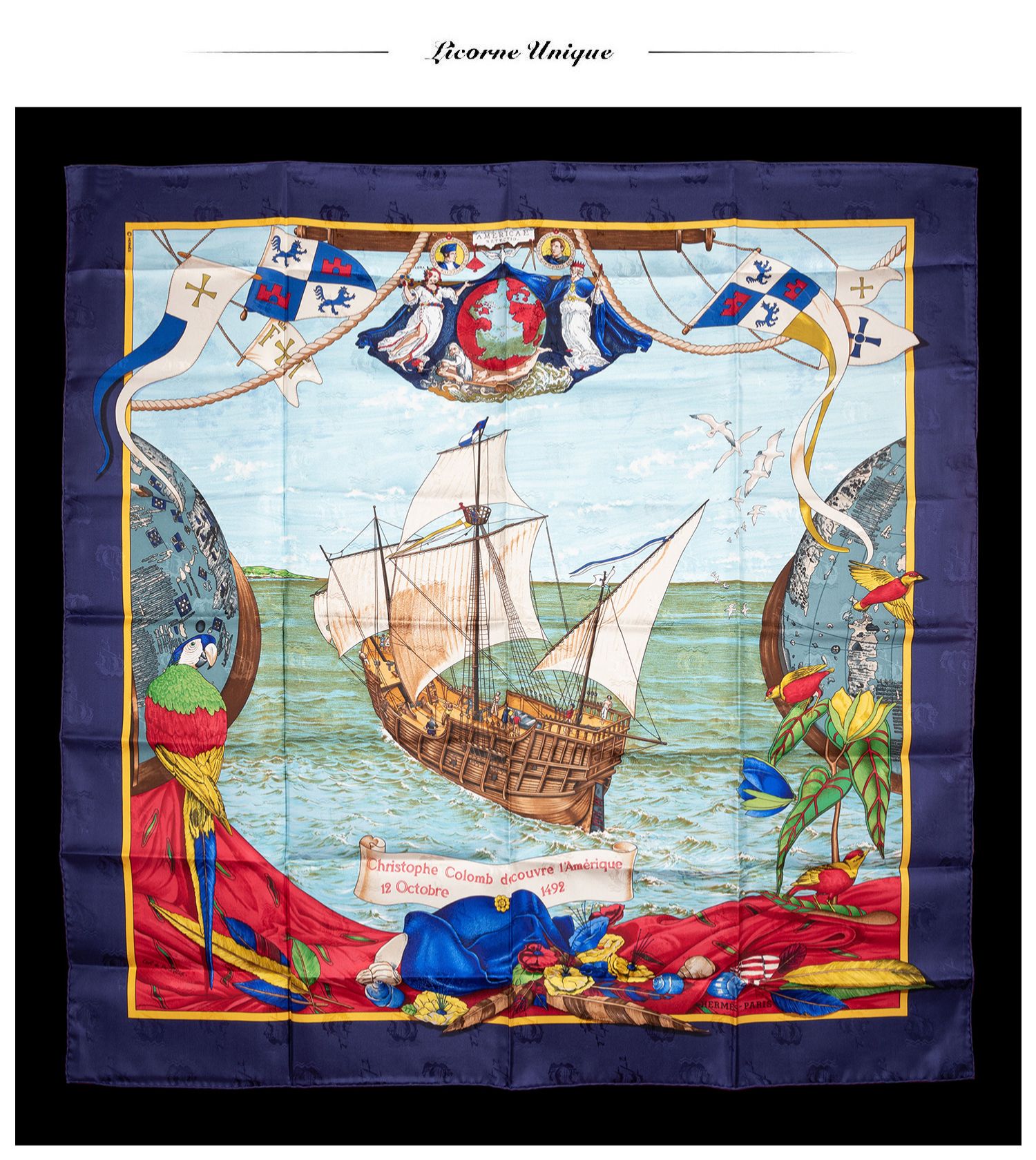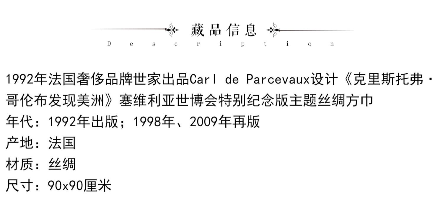 独角鹿西洋古董法国品牌《克里斯托弗·哥伦布发现美洲》方形丝巾