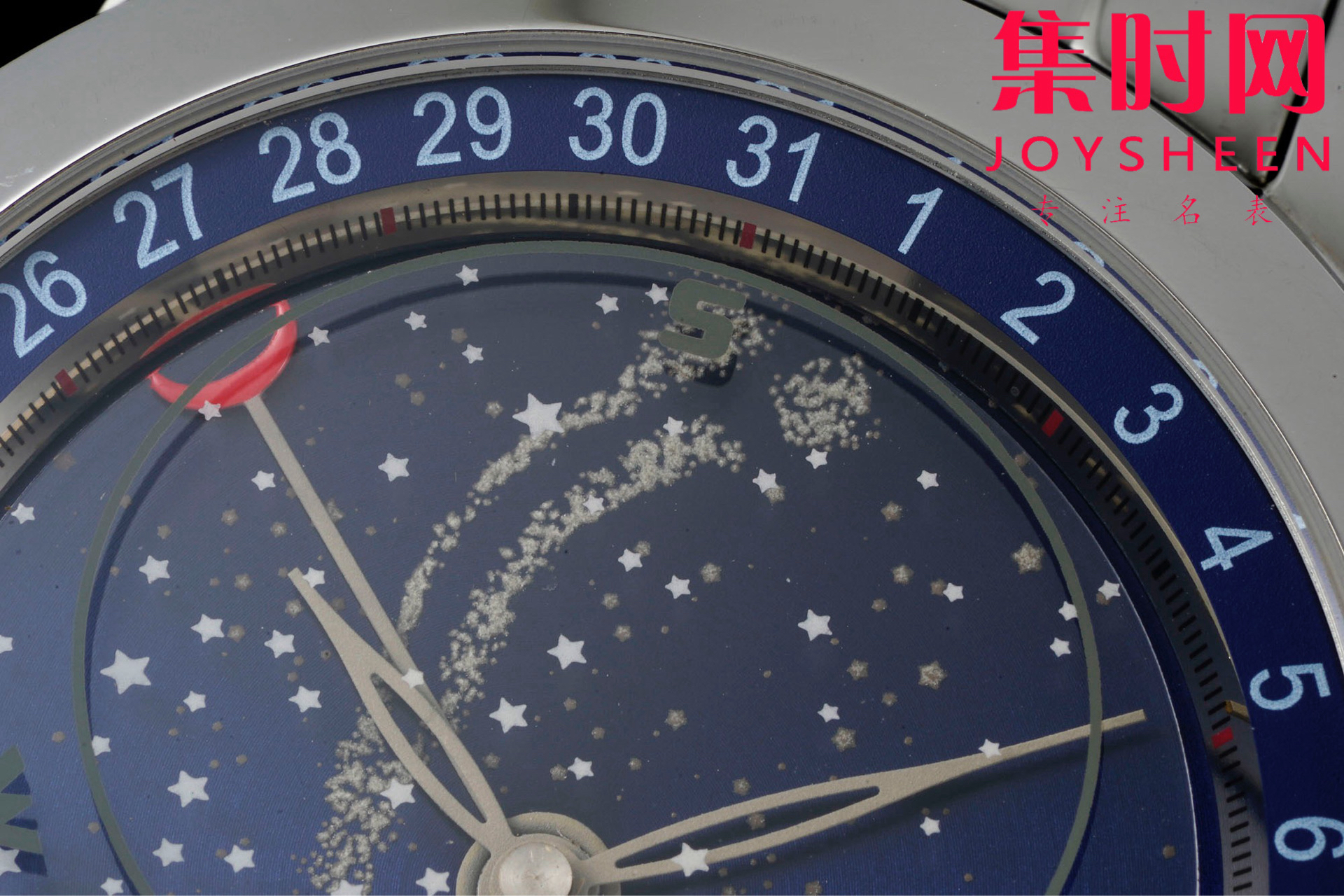 BLS百达翡丽-PP 超级复杂功能时计系列 百达翡丽星空钢带款 6102-6104系列 男士腕表 Grand Complications,天体错综复杂的芭蕾,此款天文腕表独具特色,其移动星图可再现星辰的可见运动轨迹及月球位置与盈亏变化。表镜背面镶嵌的椭圆框标定出日内瓦及同纬度所有城市上空可见的天穹视窗。日期由一枚沿表盘边缘旋转的中央指针指示。BLS采用Cal.240珍珠陀全自动机械机芯,表盘直径43.1mm,厚度仅11mm,表盘的月相会根据天上的月亮变化而变化,所谓的月圆月缺(初一为新月 十五为月圆)月相变化的顺序是:新月—娥眉月—上弦月—盈凸—满月 —亏凸—下弦月—残月—新月,这样循环,月相变化是周期性的,周期约是一个月,现此款表更新为钢带款式。