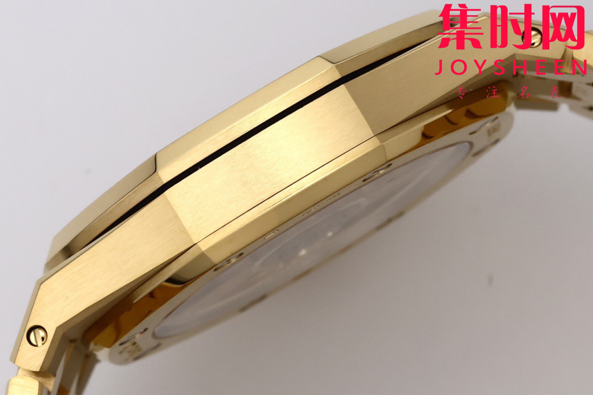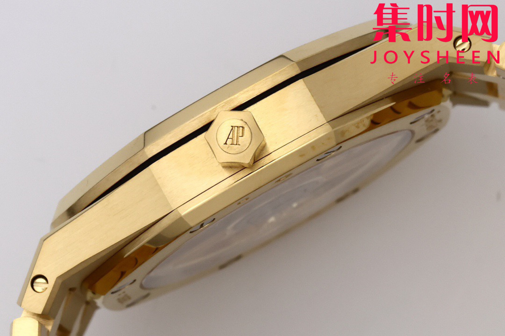 【壳套】高辨识度的八角形39mm表壳,采用先进的CNC数控加工技术对精钢原料进行初步切割与塑形,再使用精湛的拉丝工艺和锻面抛光处理在表壳上完美交织,呈现出独特光泽与质感。表带链节同样经过多道复杂打磨抛光工序制作,使链节表面细腻感十足,衔接紧密且灵活。确保佩带时的舒适度与贴合度。表扣上的AP标志,经过精雕细刻,线条清晰,钢硬立体。在表壳侧面,表耳与表带自然衔接,过渡圆润,展现出浑然一体的和谐美感!