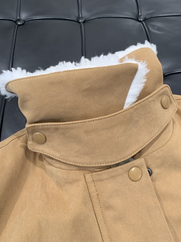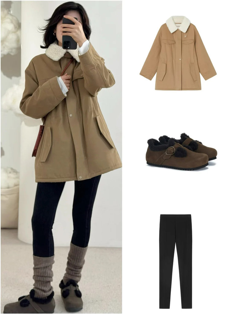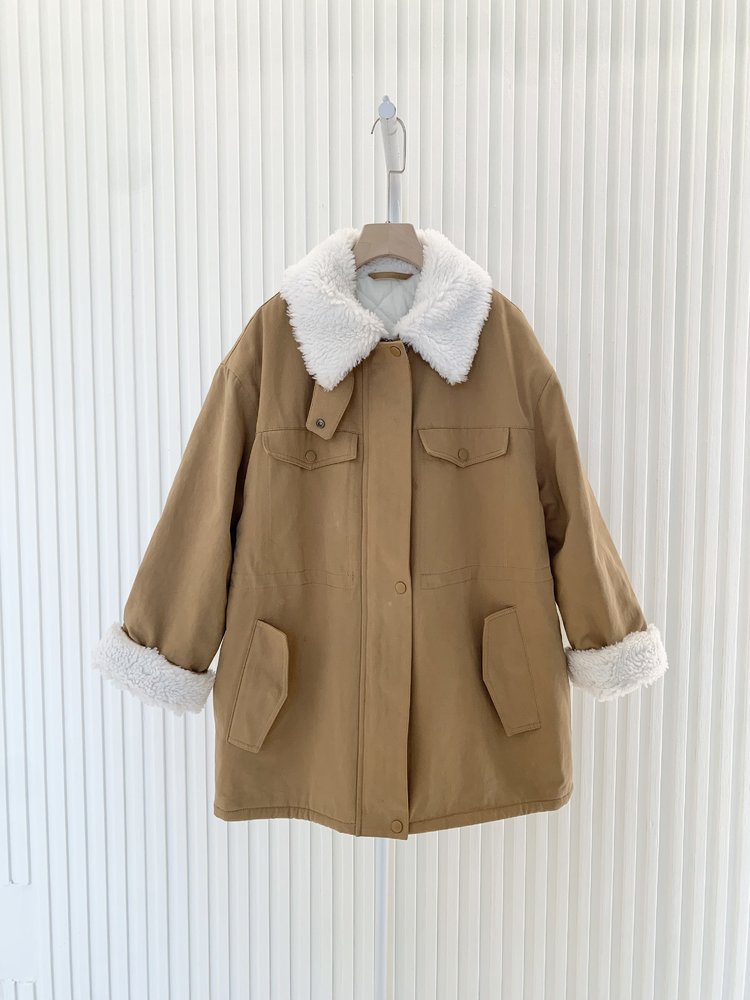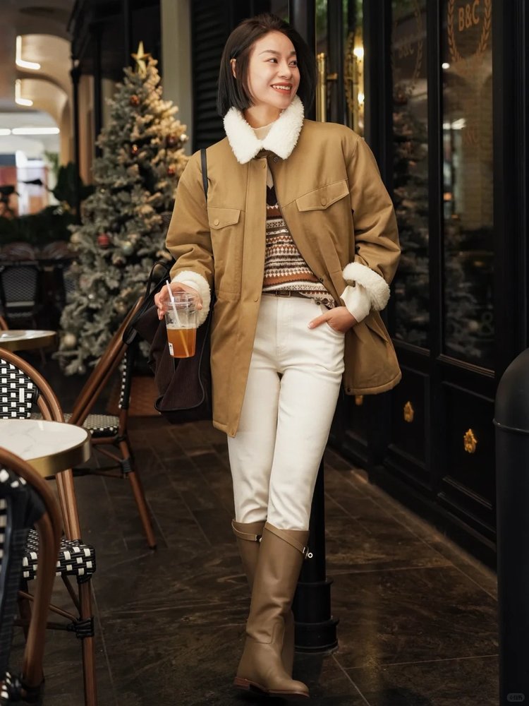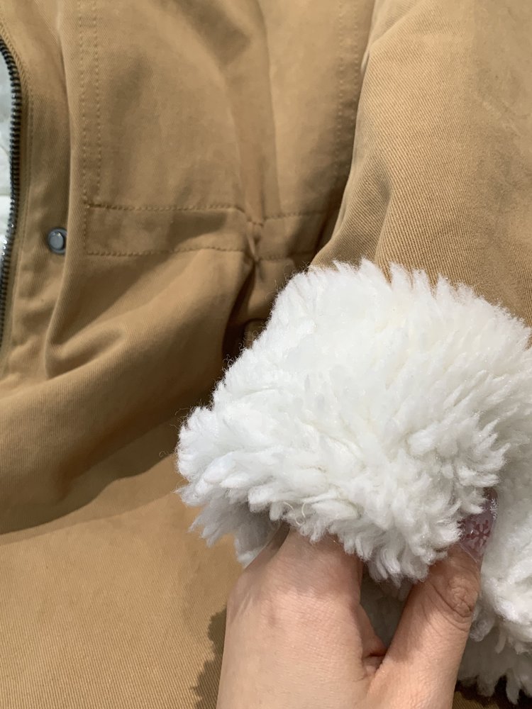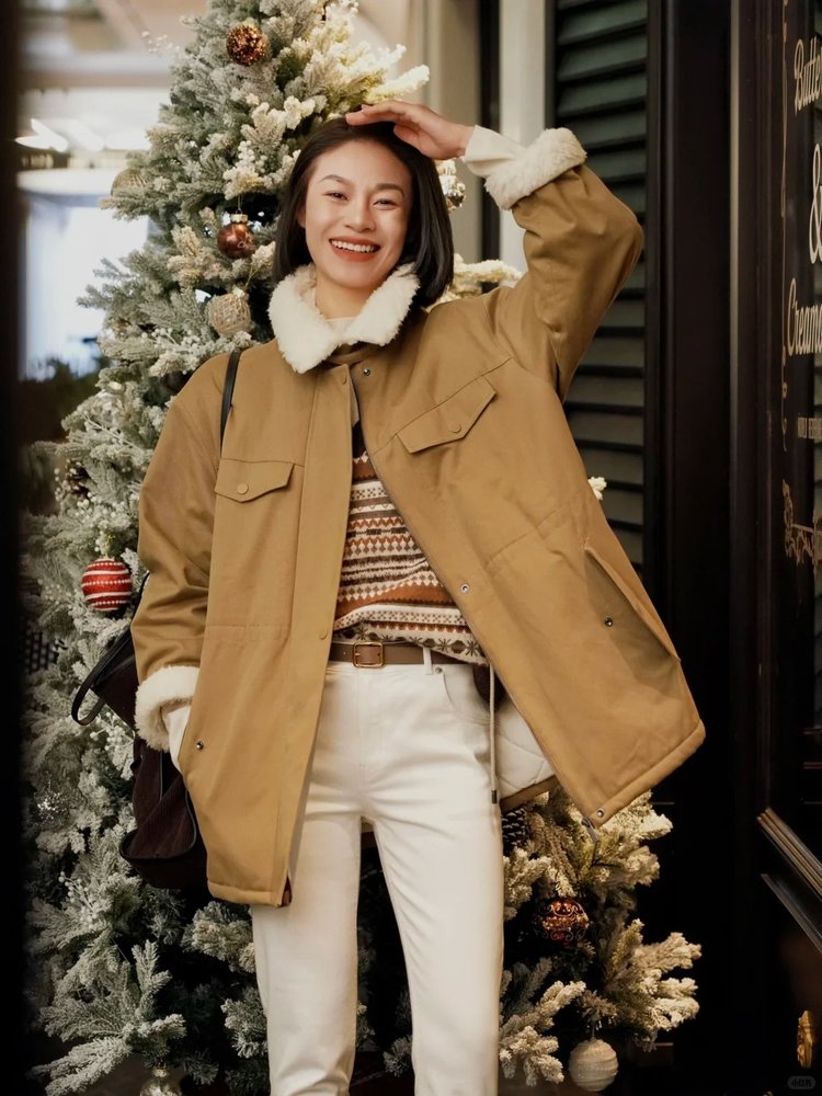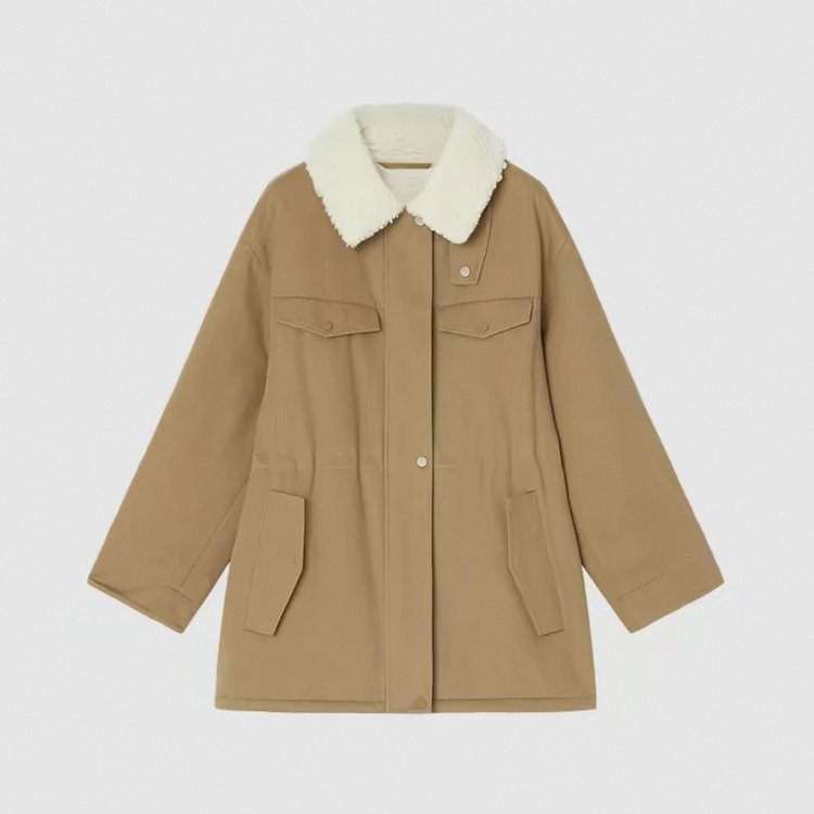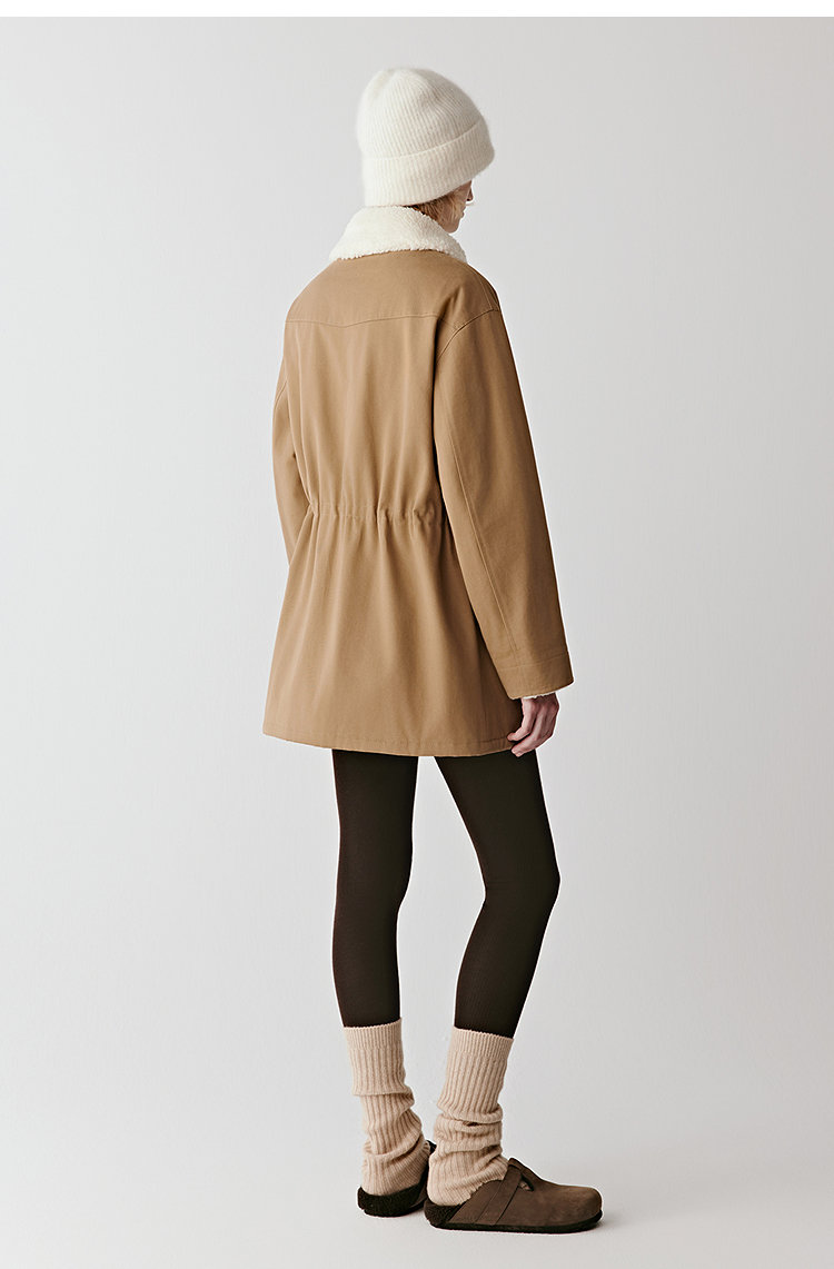 小禾同款卡其色收腰棉服,领口拼接羊剪绒,穿出复古率性与温柔力量