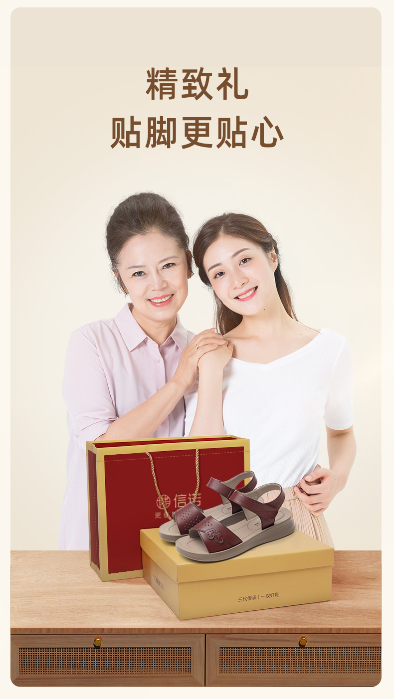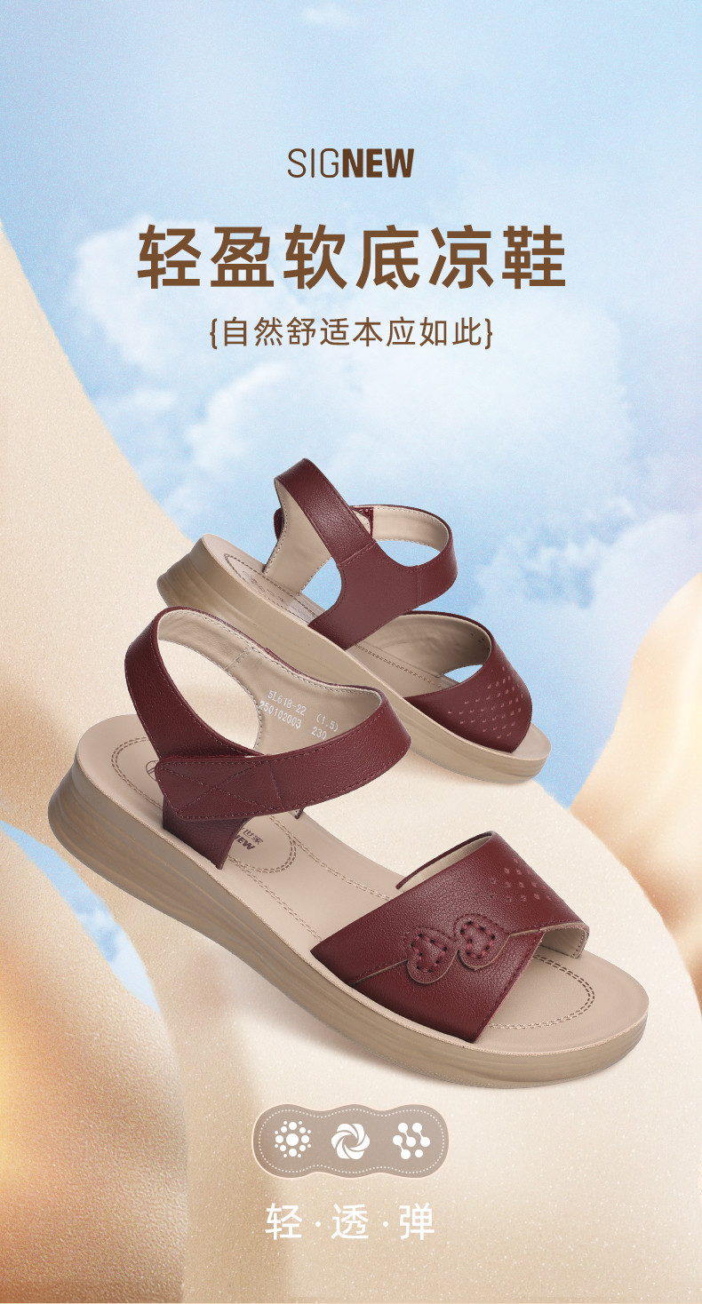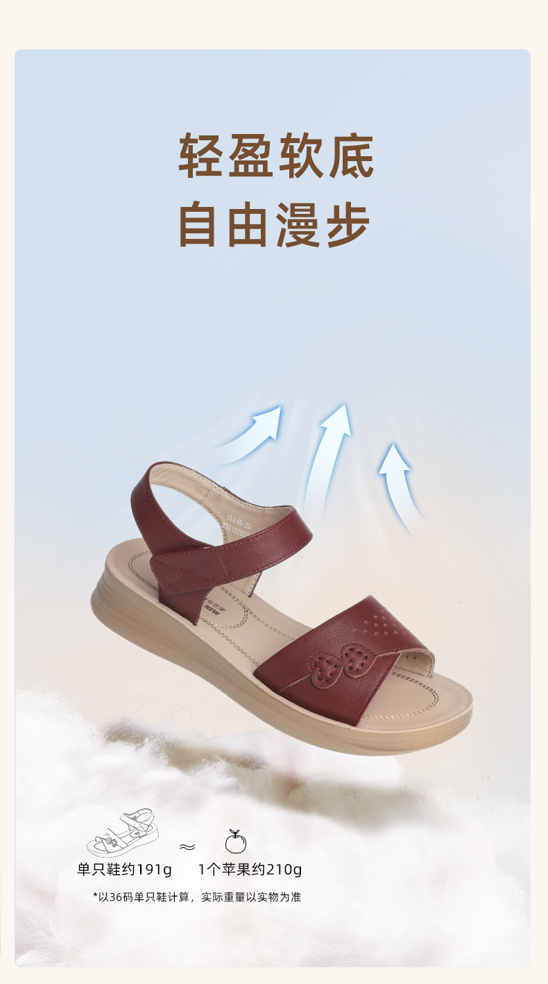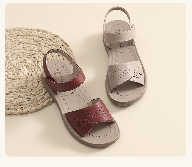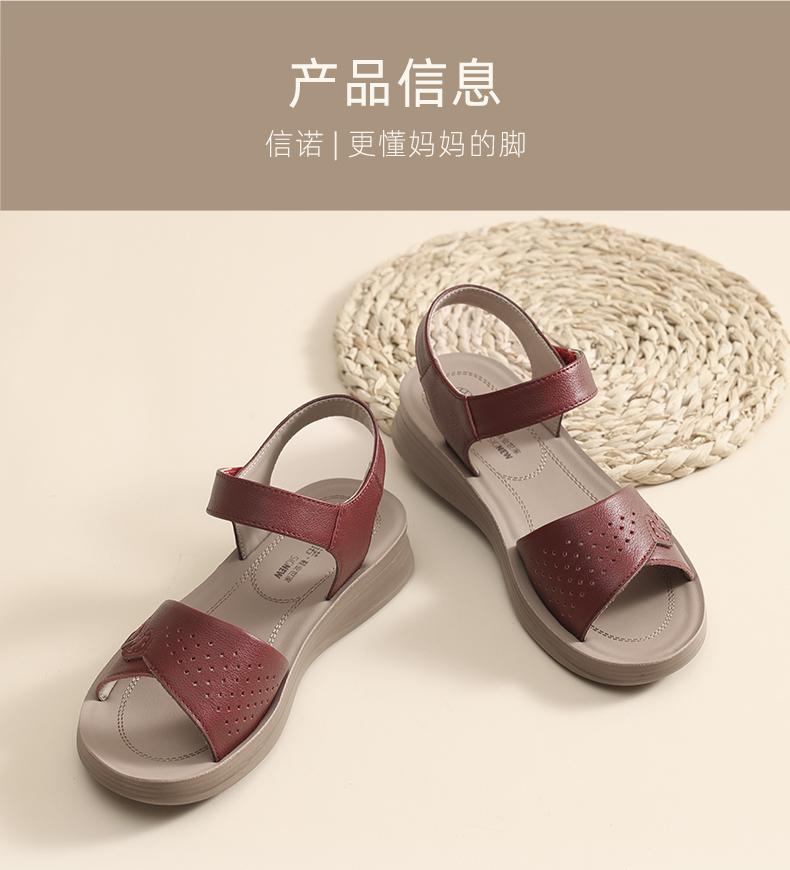信诺真皮妈妈凉鞋女防滑软底夏季老人皮鞋舒适平底魔术贴中老年5L618-22