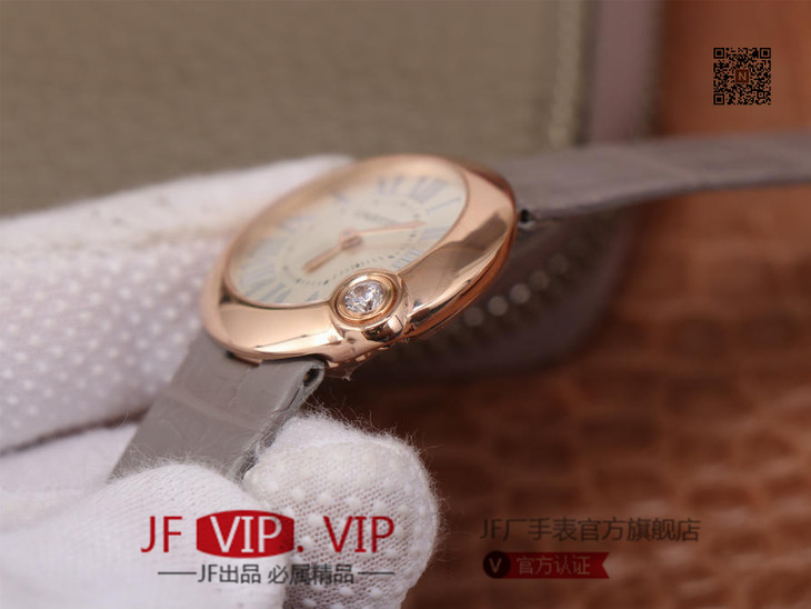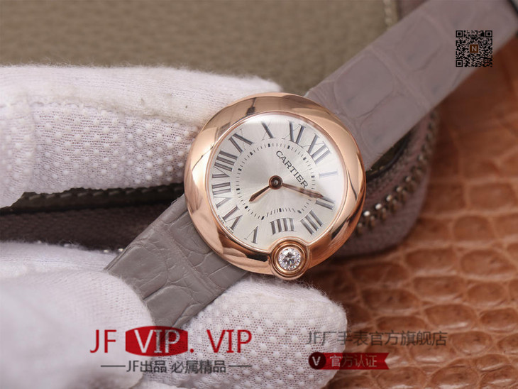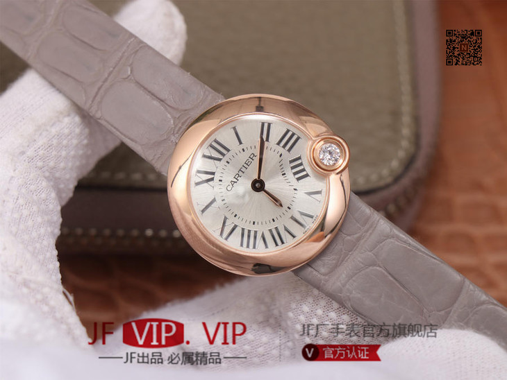 卡地亚Ballon Blanc de Cartier系列,尺寸30mm,瑞士朗达石英机芯+Cartier专用甲板 ,4点钟表冠镶嵌一颗0.14克拉的钻石,女士