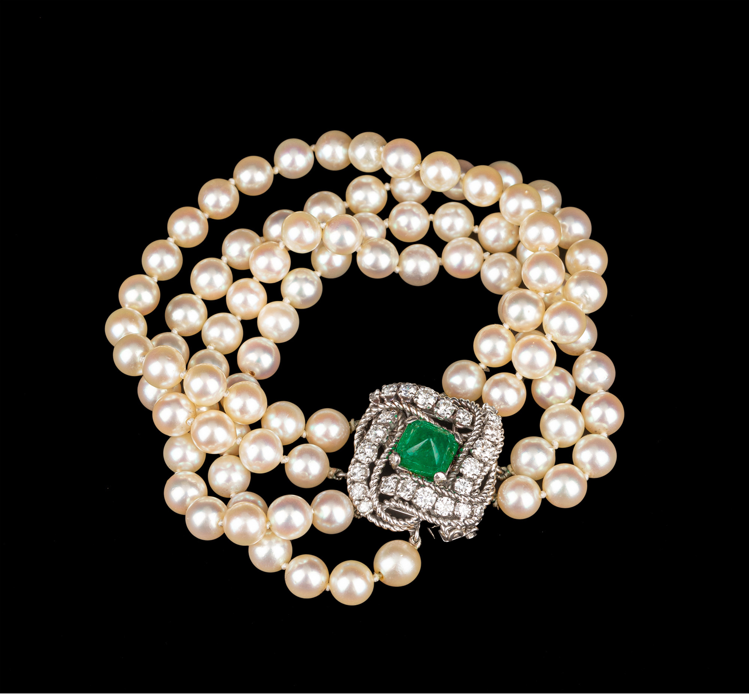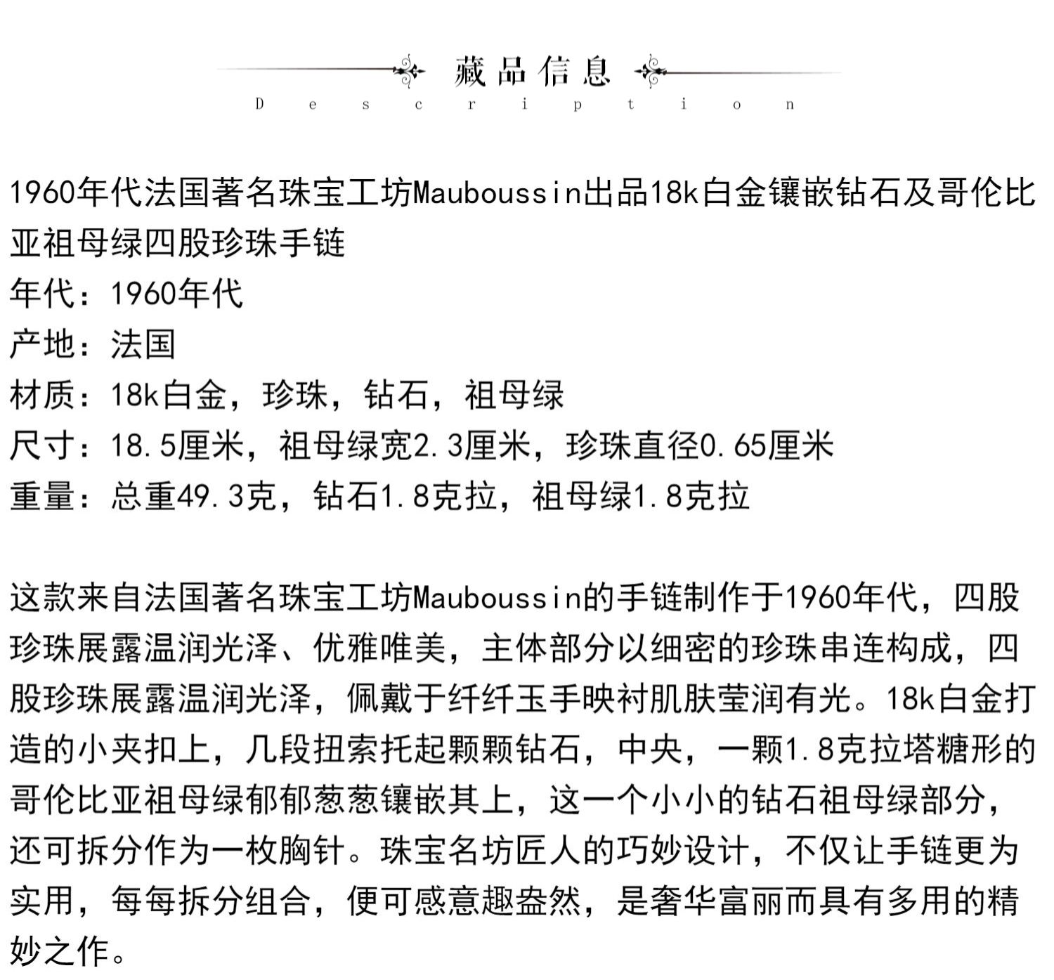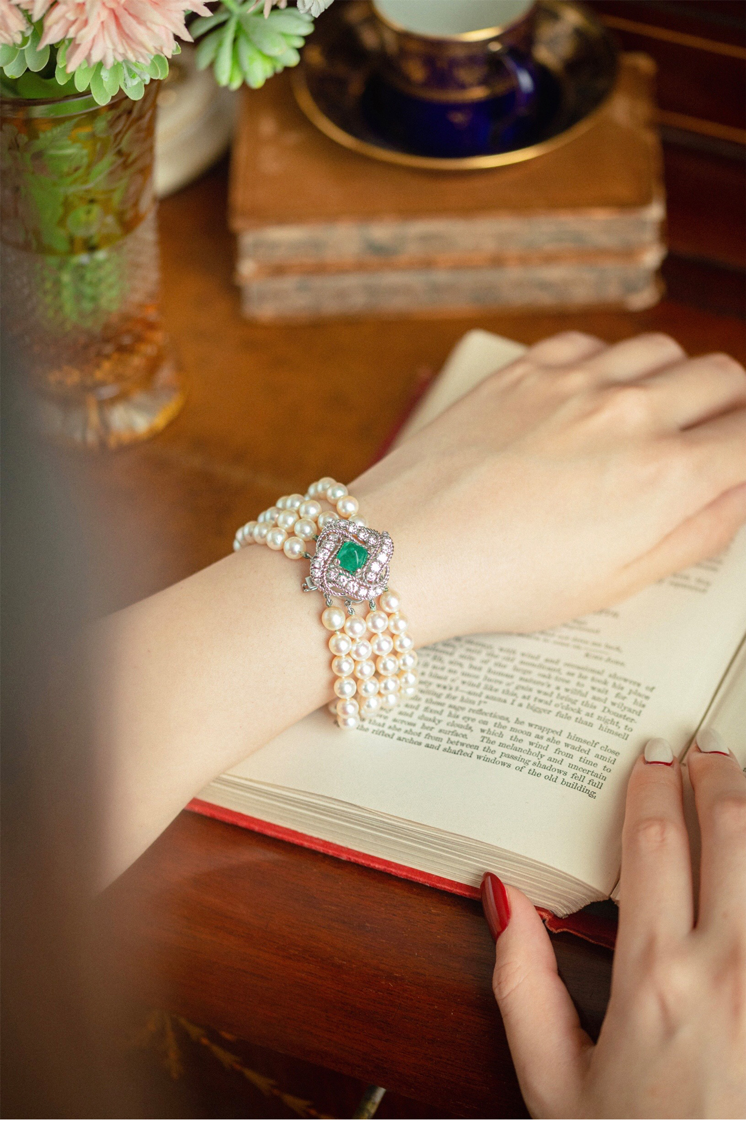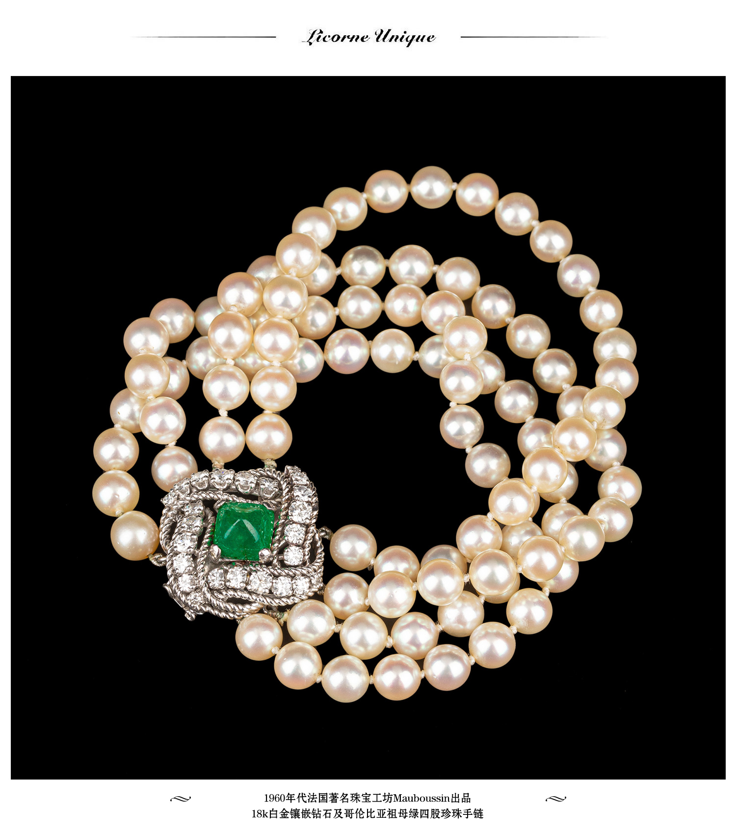 独角鹿西洋古董法国18K白金镶钻石哥伦比亚祖母绿四股珍珠手链