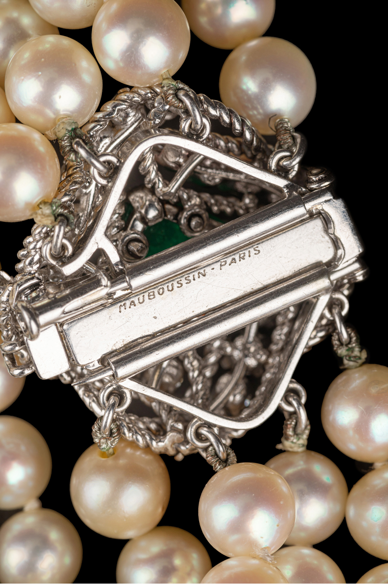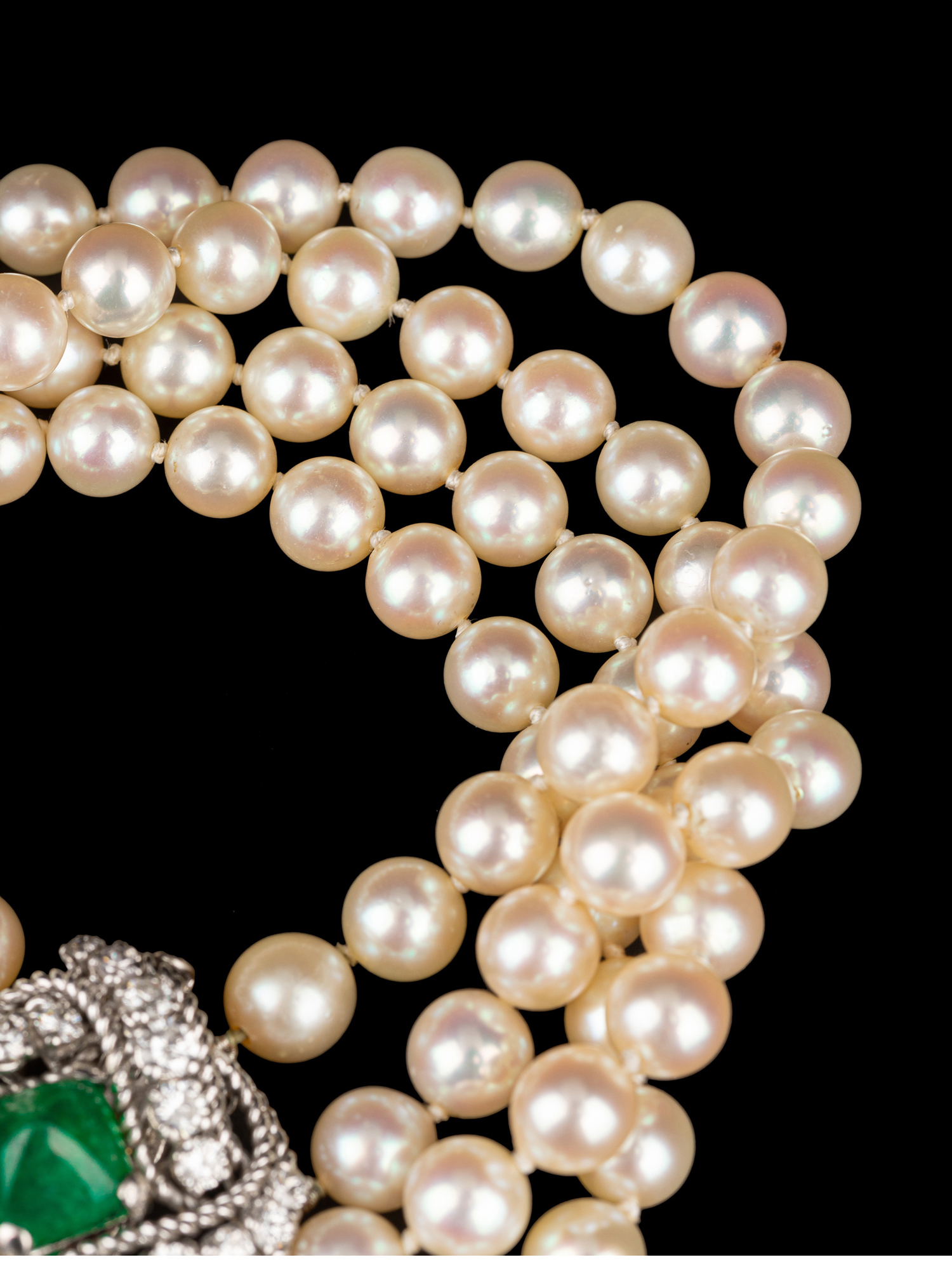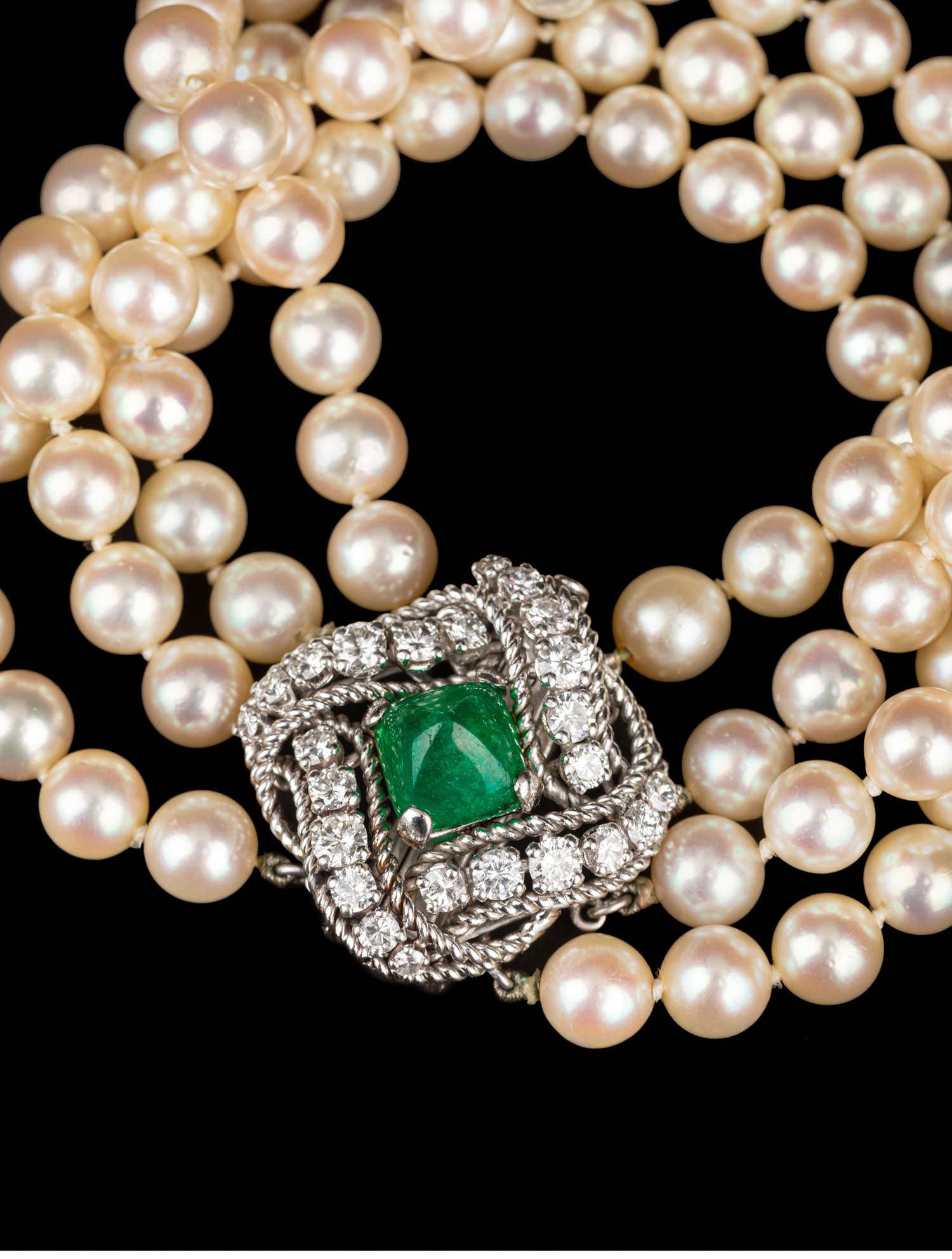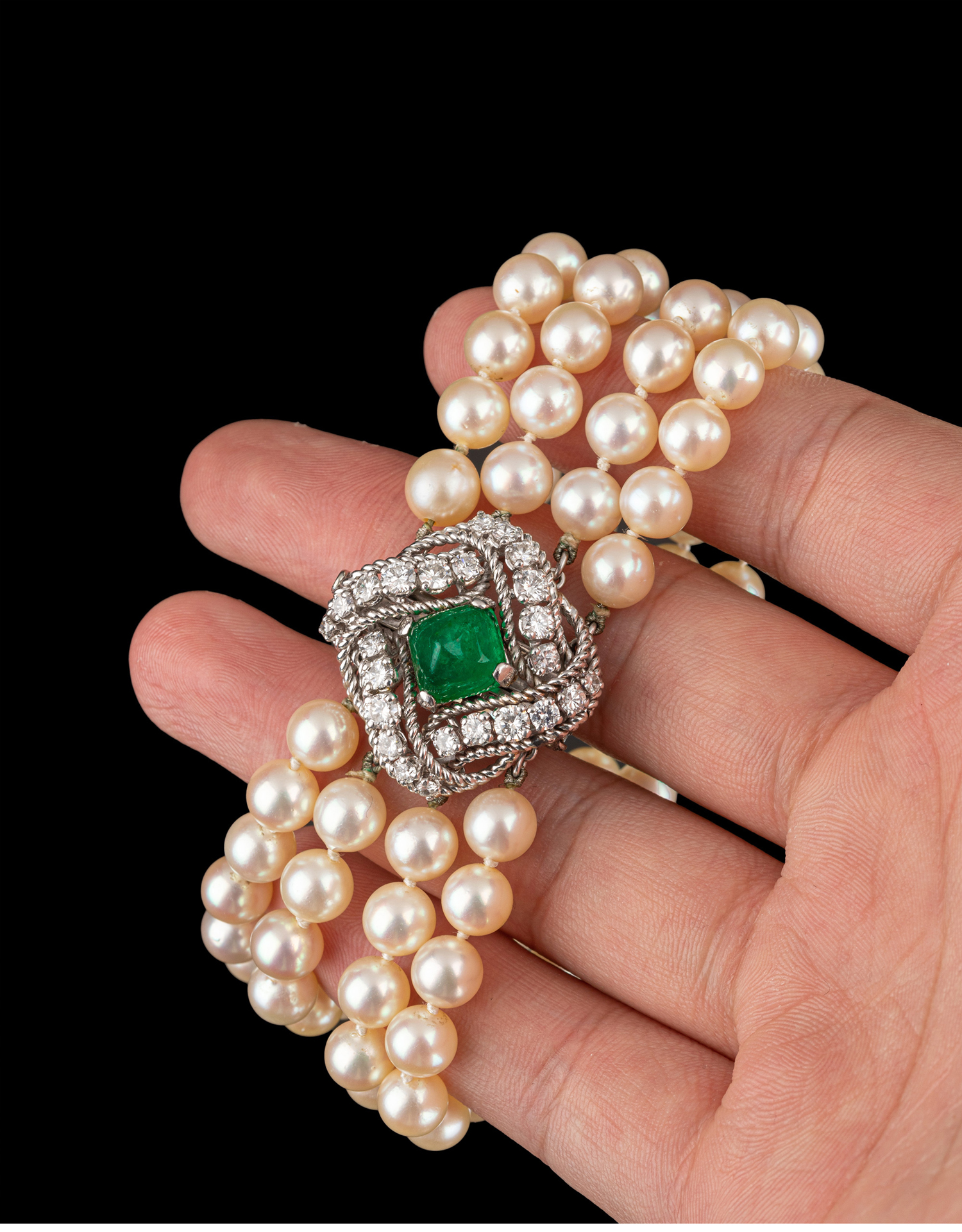 独角鹿西洋古董法国18K白金镶钻石哥伦比亚祖母绿四股珍珠手链