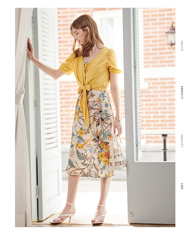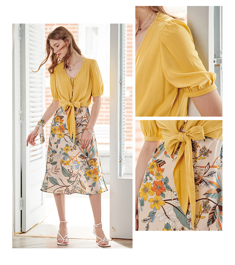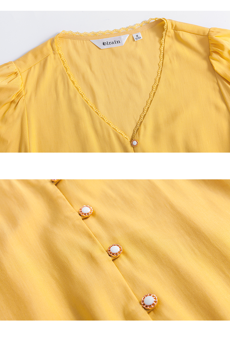 欧芮儿夏装新款v领短袖衬衫女绑带蕾丝花边雪纺衫黄色上衣ins