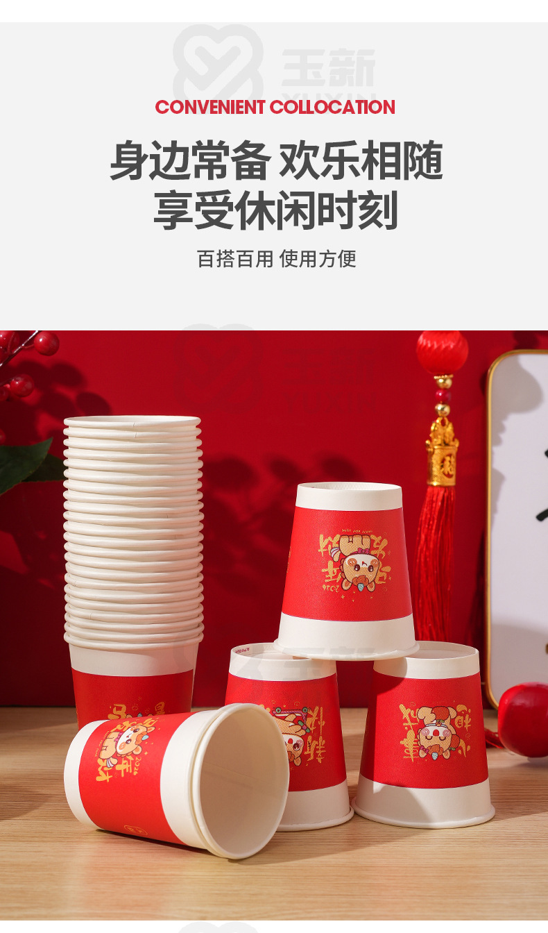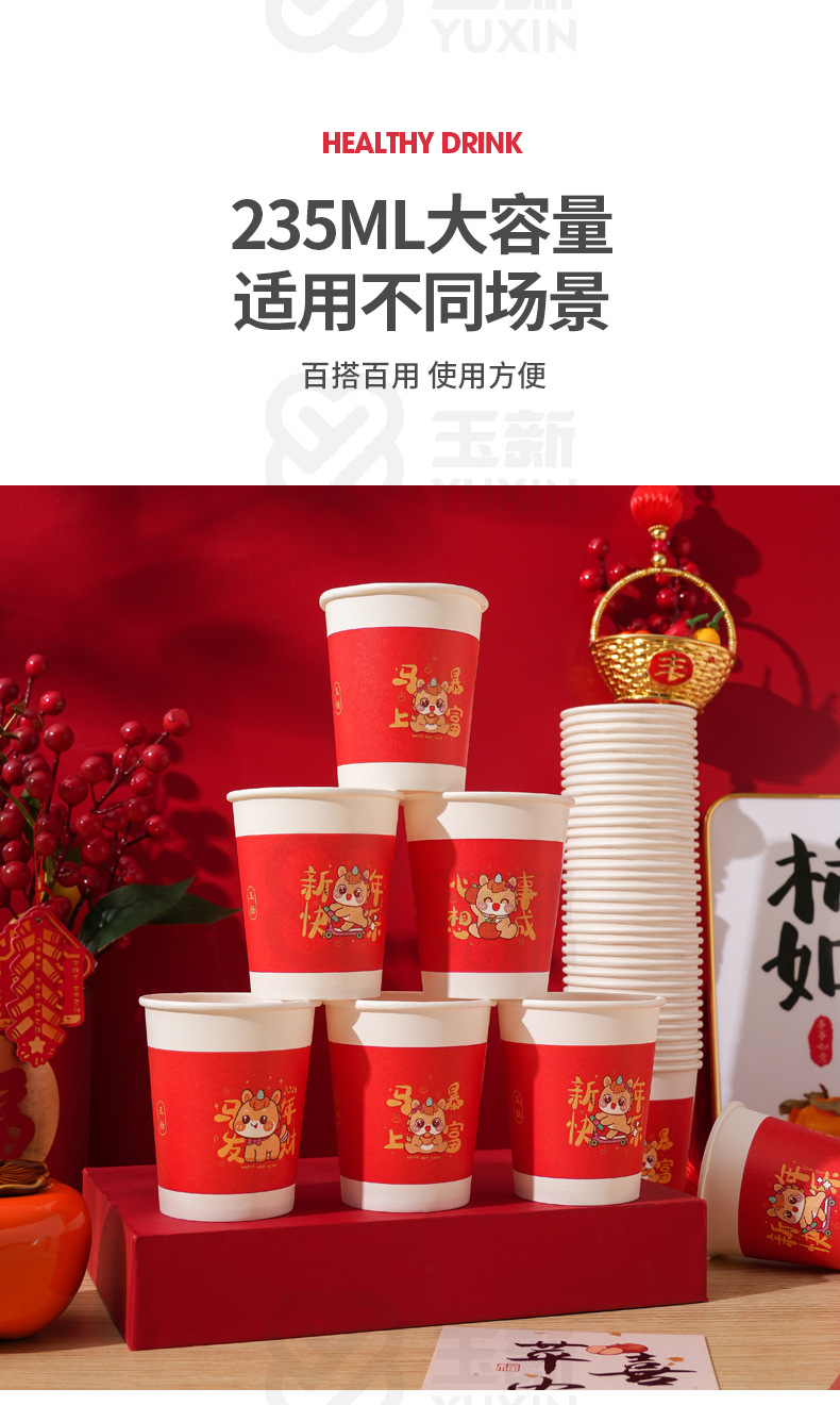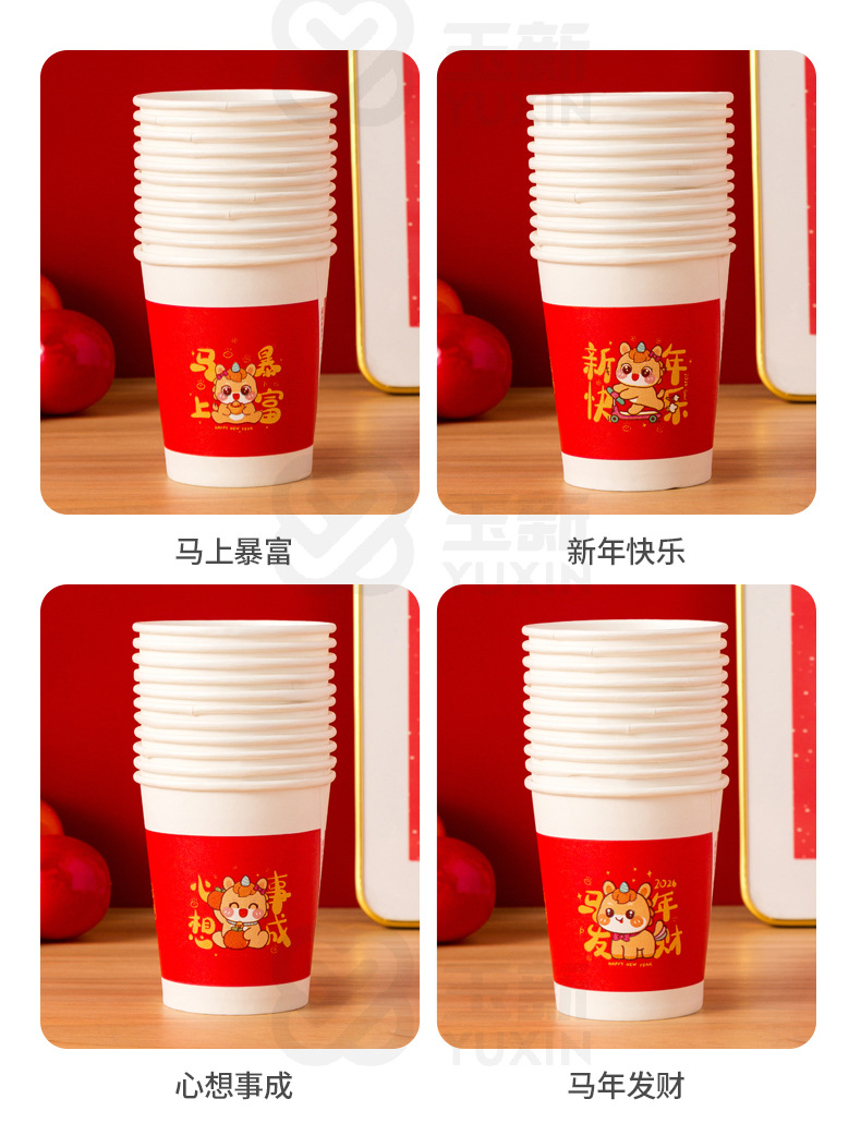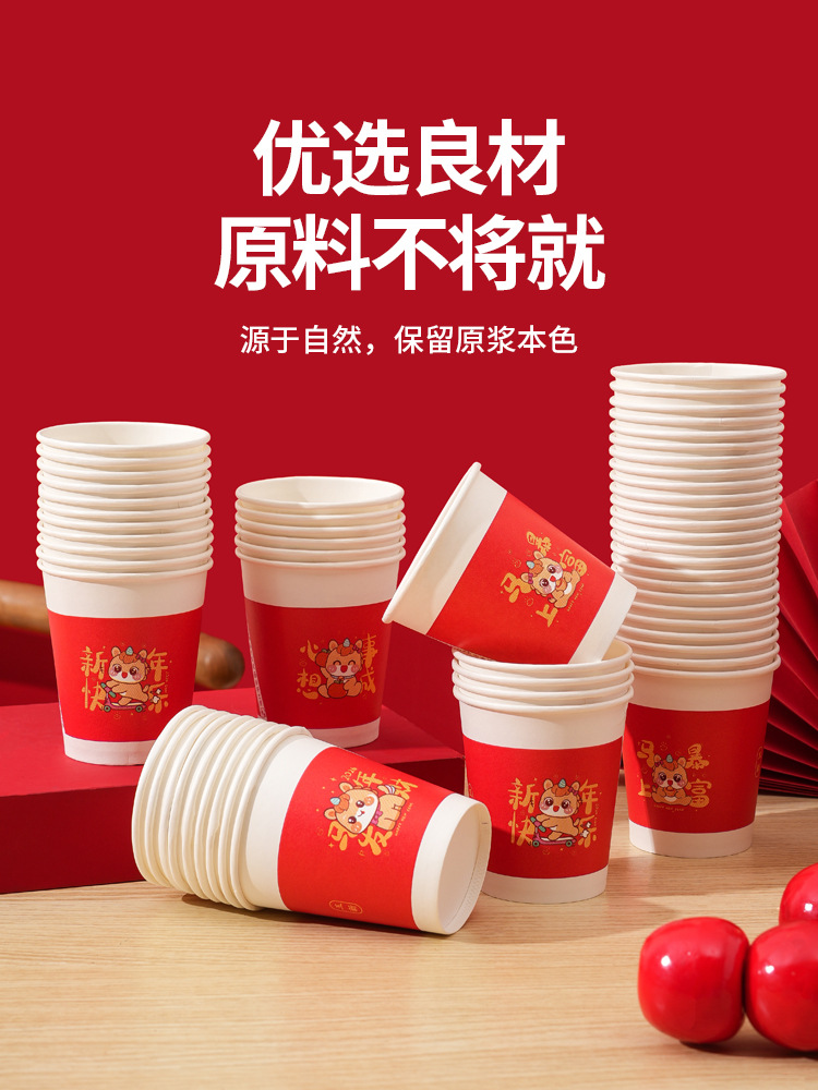 「买1送1!到手2包100只」2026马年一次性纸杯水杯子红色喜庆家用加厚茶杯新年春节喜庆纸杯餐饮用具