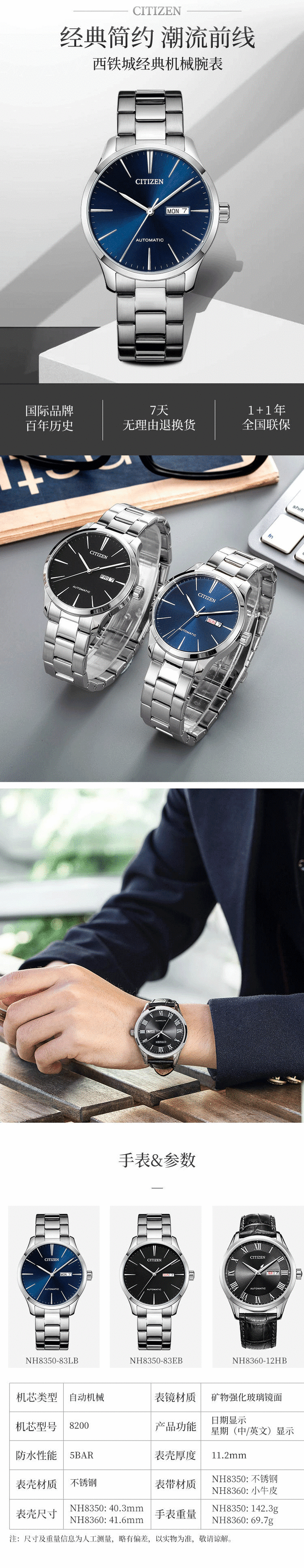 西铁城官方正品防水经典复古自动机械男表NH8350-83EB