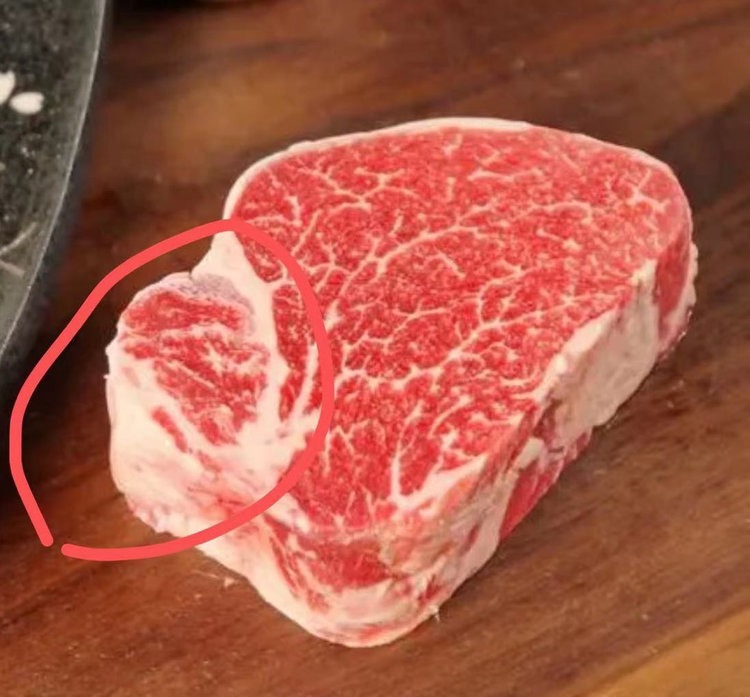 在整条菲力的侧面,通常会有一块口感很好但形状不够规整的突出的雪花肉❄️