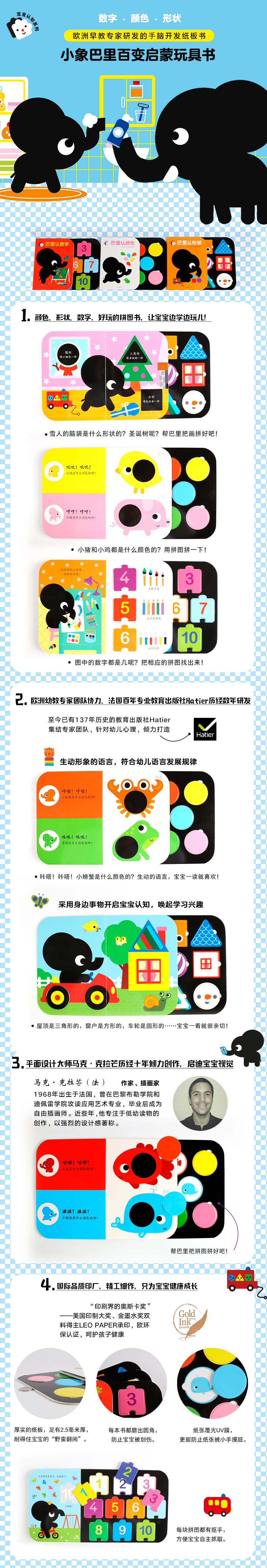 《小象巴里百变启蒙玩具书》由法国平面设计马克?克拉芒历经十年时间创作,采用安全优质材料,通过推拉、触摸、拼图、翻翻等多种形式与孩子互动,让他们在翻动和游戏的过程中,感受书的乐趣,在心里种下热爱阅读、热爱学习的种子。