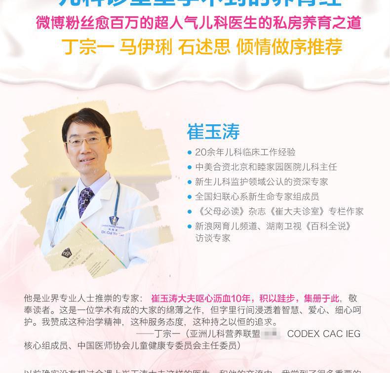 《崔玉涛:宝贝健康公开课》是超人气儿科医生崔玉涛大夫在《父母推荐阅读》杂志写作专栏《崔大夫诊室》10年的集大成之作。《崔玉涛:宝贝健康公开课》的内容分为宝宝的营养、常见病和护理三大部分。通过一个个诊室真实案例的分析,细致入微、深入浅出地将养育的要点娓娓道来,同时传播国际最前沿的养育知识,帮助家长建立正确的养育观。