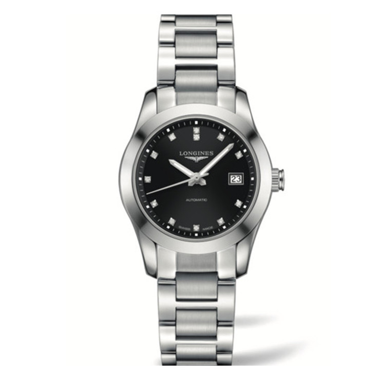 镜面 材质 | 蓝宝石水晶玻璃 | 表盘 | 精钢表壳 黑色表盘 镶钻时标镶嵌12颗顶级韦塞尔顿VVS级钻石,总重0.048克拉. Super-LumiNova®夜光 大三针 日期显示 透底 |