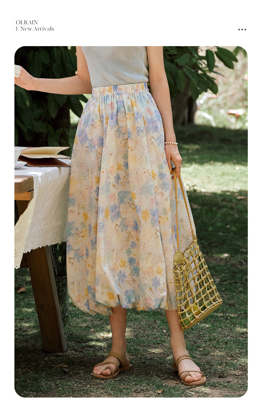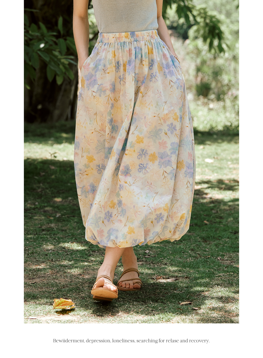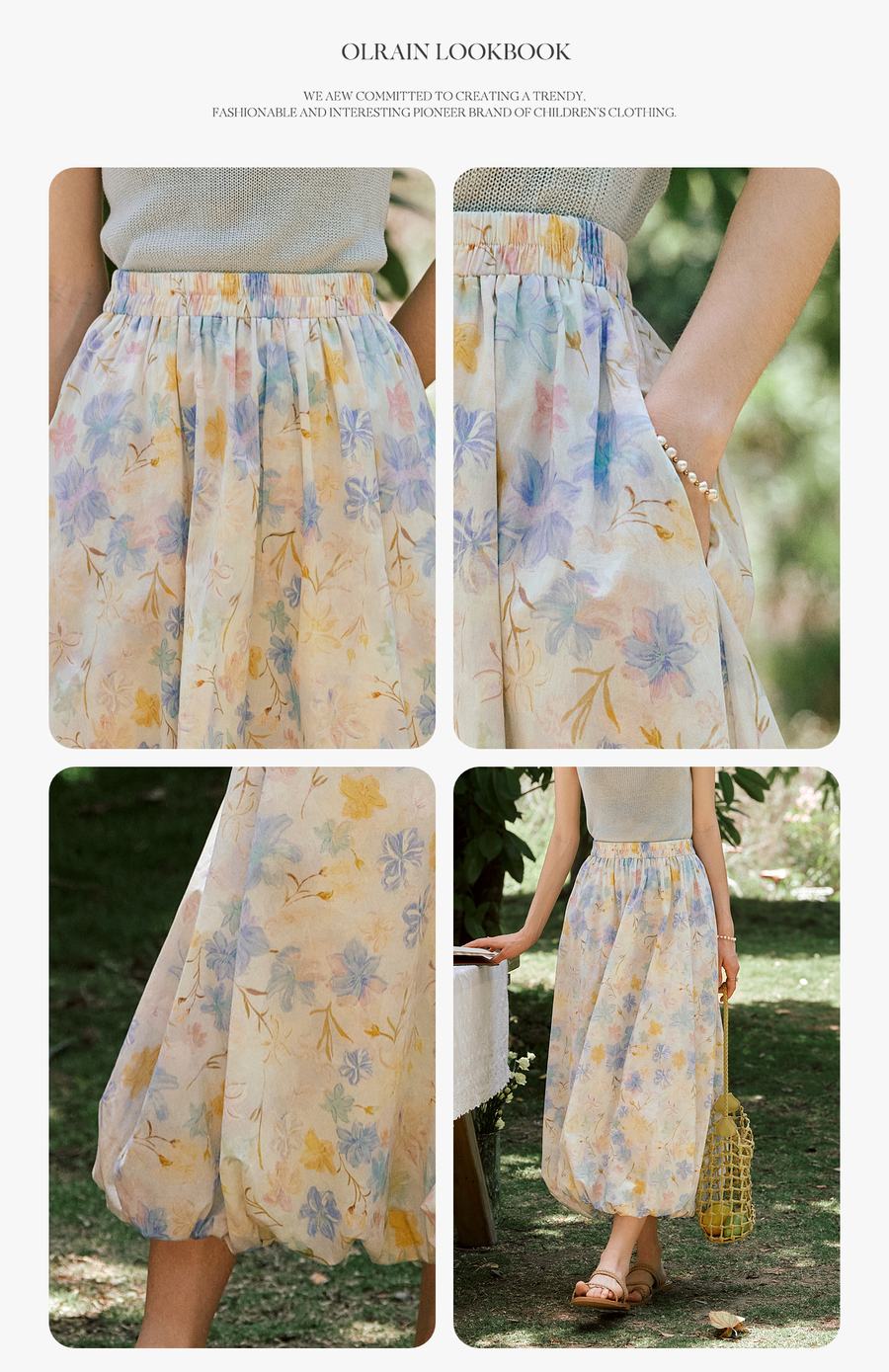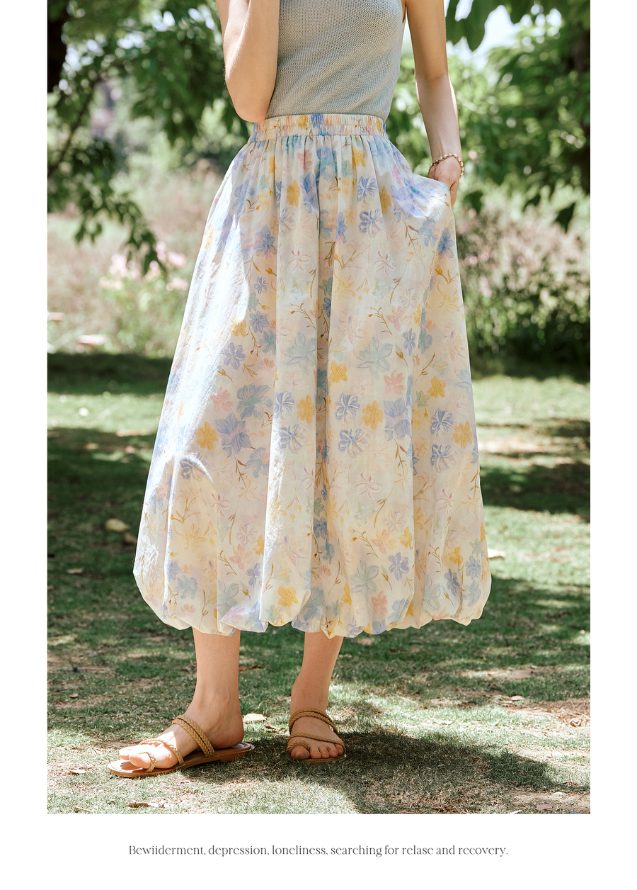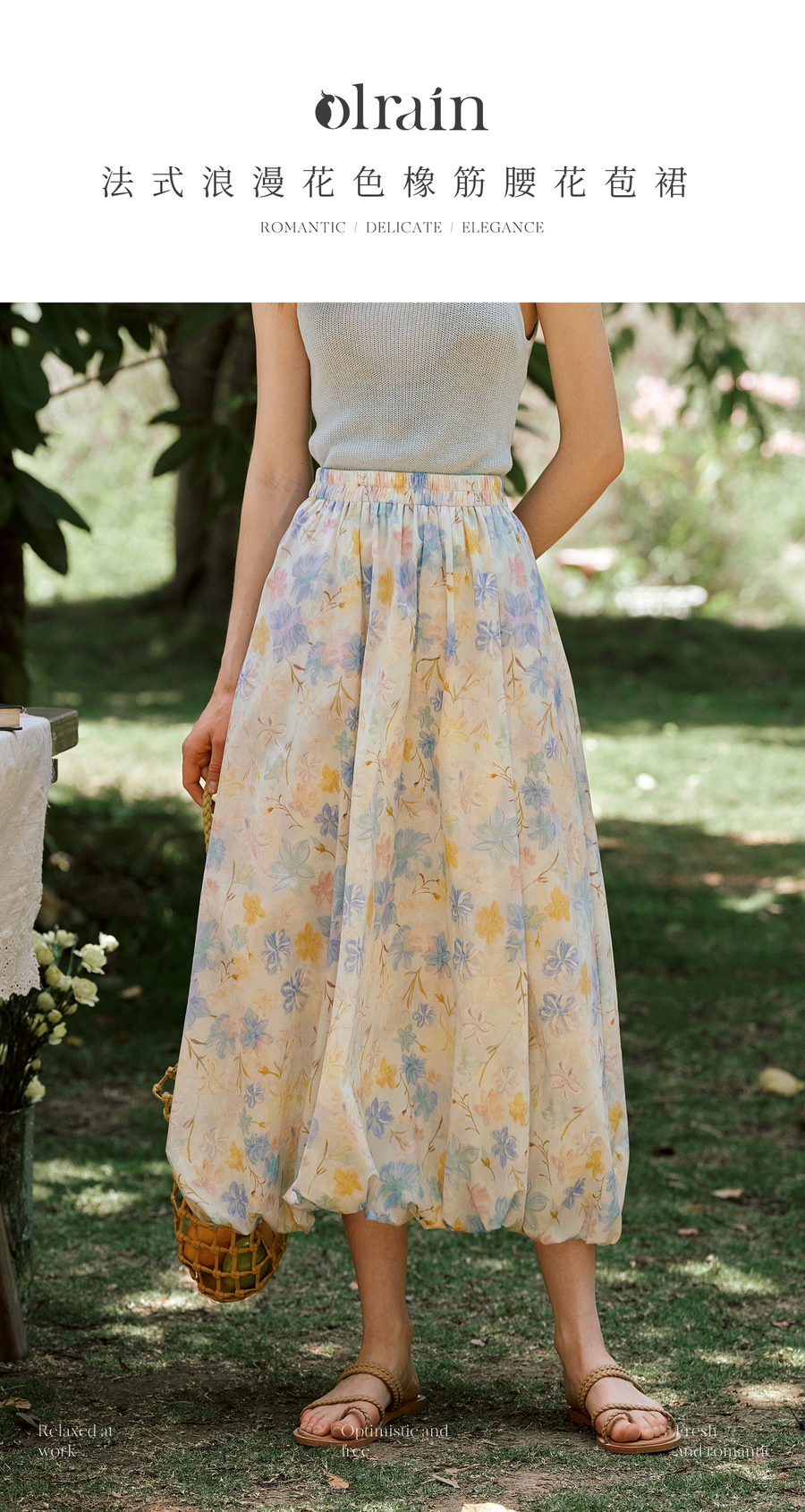 OLrain欧芮儿法式浪漫花色橡筋腰花苞裙女夏季2025新款休闲裙子