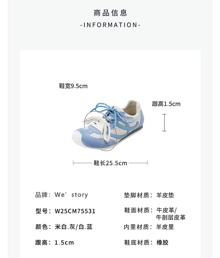 Westory2025年夏季平底镂空双数鞋带运动鞋德训鞋W25CM75531
