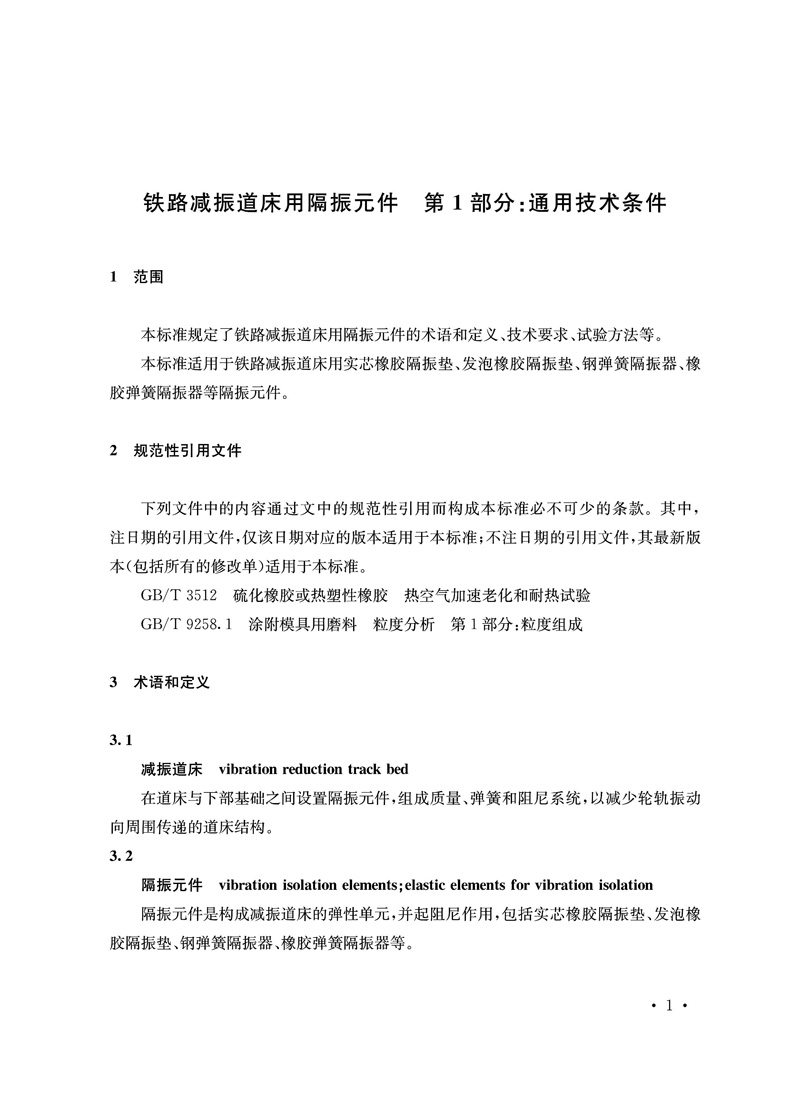 本标准适用于铁路减振道床用实芯橡胶隔振垫、发泡橡胶隔振垫、钢弹簧隔振器、橡胶弹簧隔振器等隔振元件。
