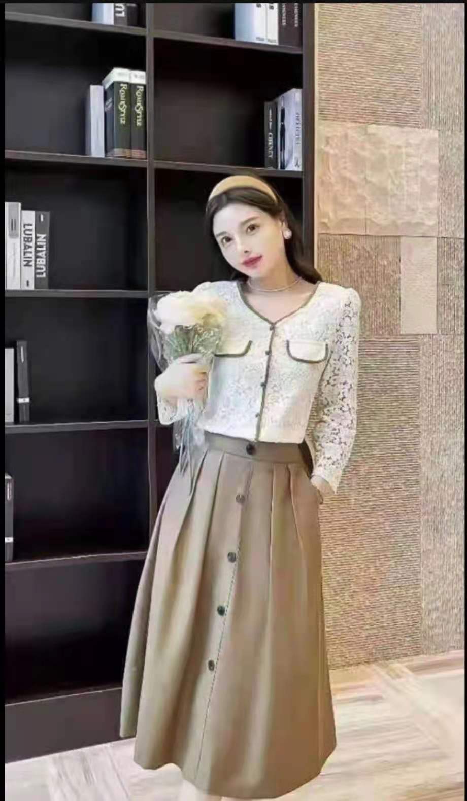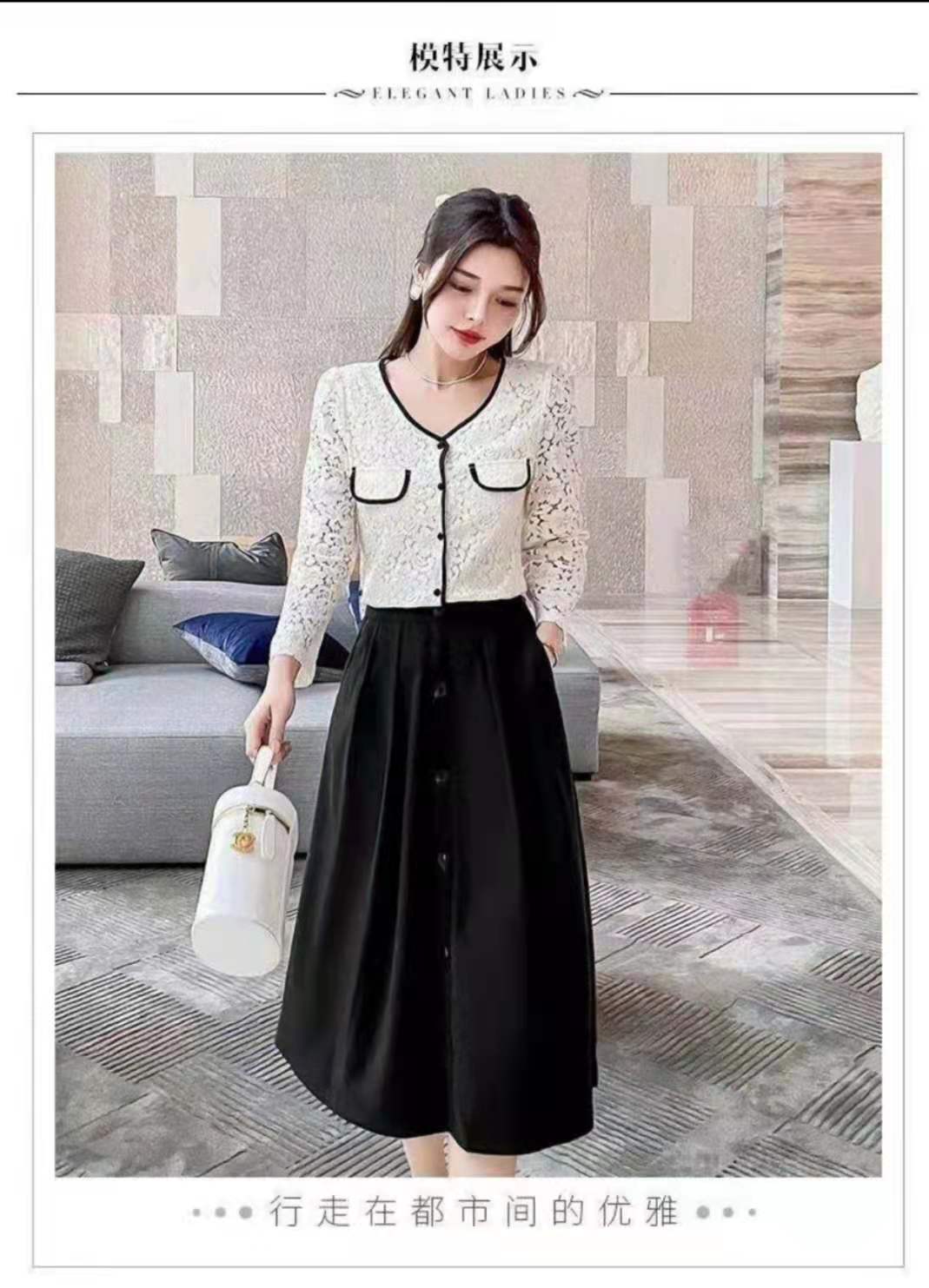 特点:分体套裙,简洁大方的V领,蕾丝面料,性感上档次,前排扣子颜色和下裙相呼应,A字裙简单大气,包容性强,特别显瘦。