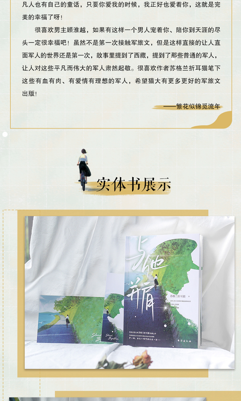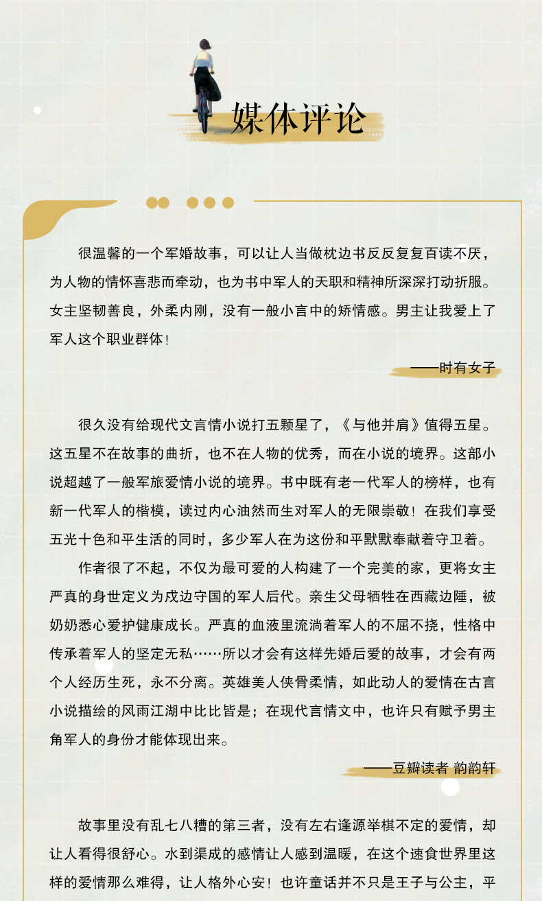 很久没有给现代文言情小说打五颗星了,《与他并肩》值得五星。这五星不在故事的曲折,也不在人物的优秀,而在小说的境界。这部小说超越了一般军旅爱情小说的境界。书中既有老一代军人的榜样,也有新一代军人的楷模,读过内心油然而生对军人的无限崇敬!在我们享受五光十色和平生活的同时,多少军人在为这份和平默默奉献着守卫着。