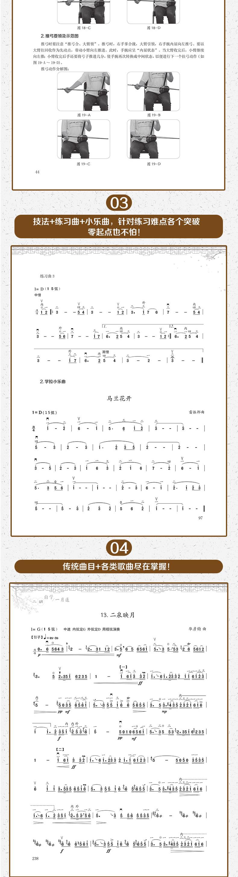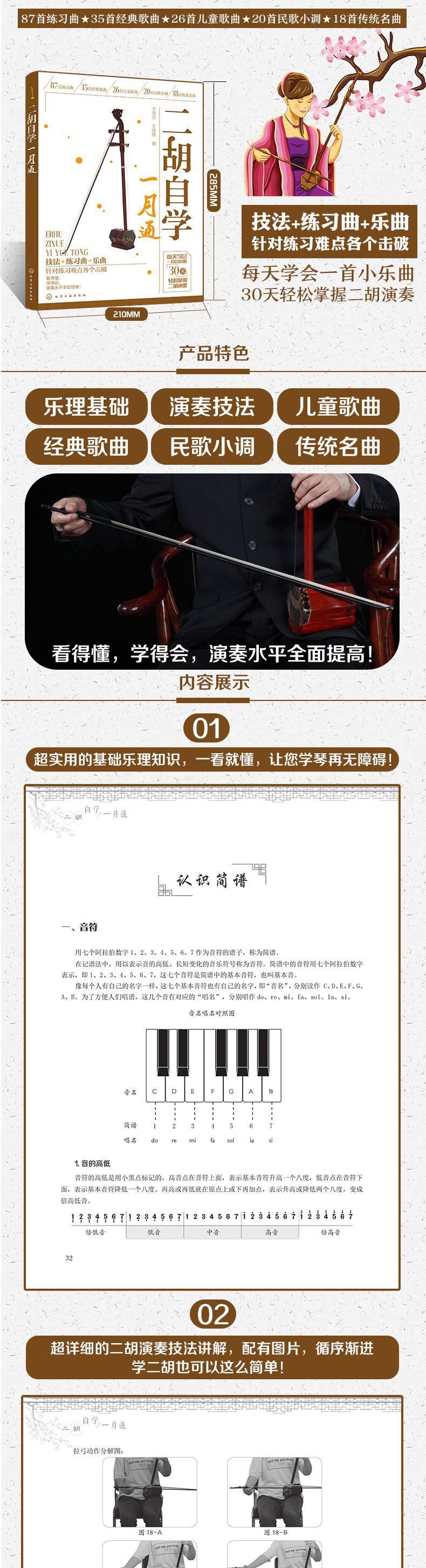 本书是一本针对二胡初学者的入门教程,旨在帮助读者在短期内掌握二胡的基本演奏方法,演奏出悦耳动听的乐曲。本书分为上下两个部分,上部分详细讲述了二胡演奏的各种基本技法,下部分精心编选了大量耳熟能详的二胡经典曲集,内容丰富,可以更好地调动练习者的学习积极性。