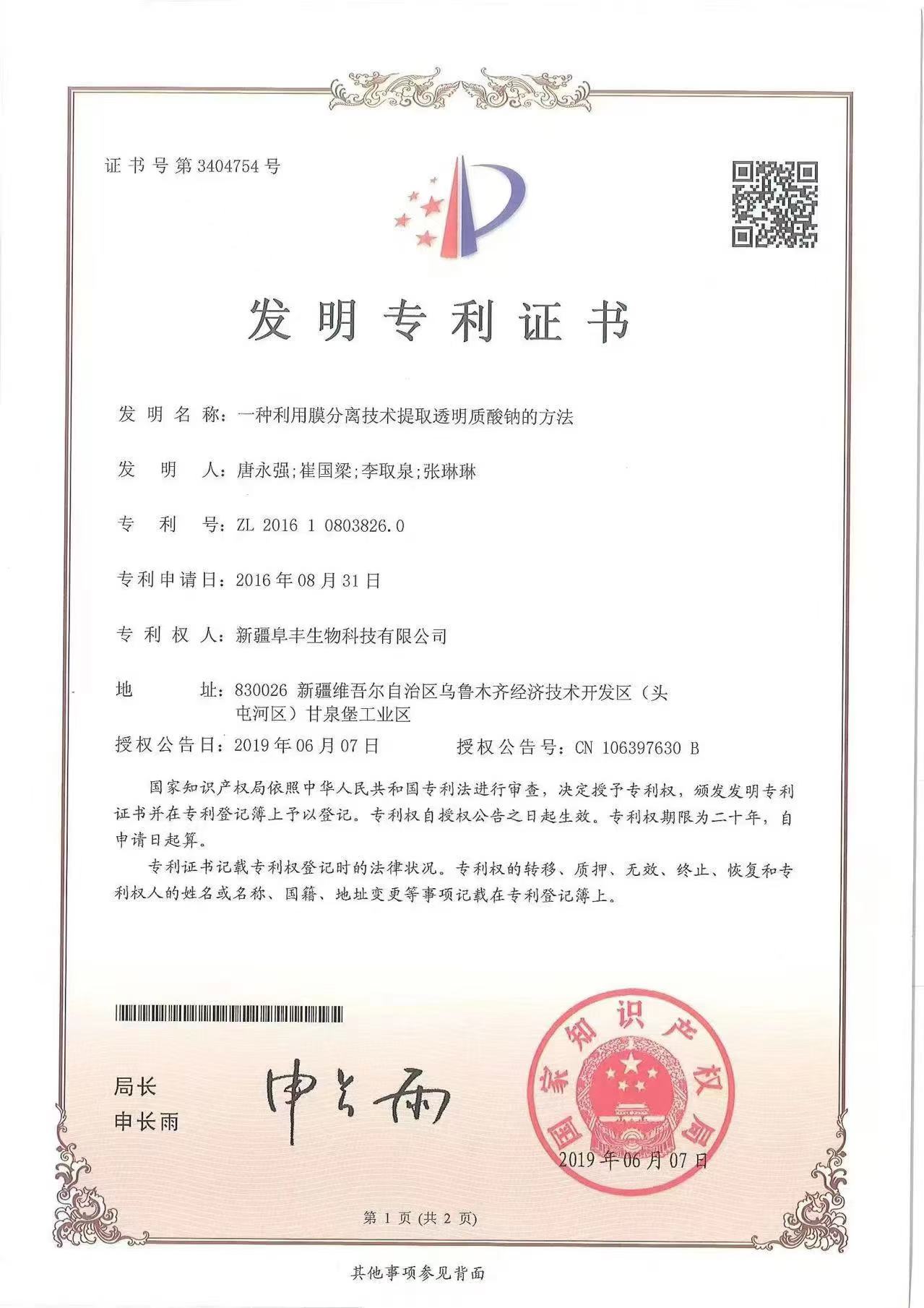 1.专利号:ZL 2021 1 1296847.5: (羟丙基四氢吡喃三醇) 2. 专利号:ZL 2016 1 0803826.0 :透明质酸钠