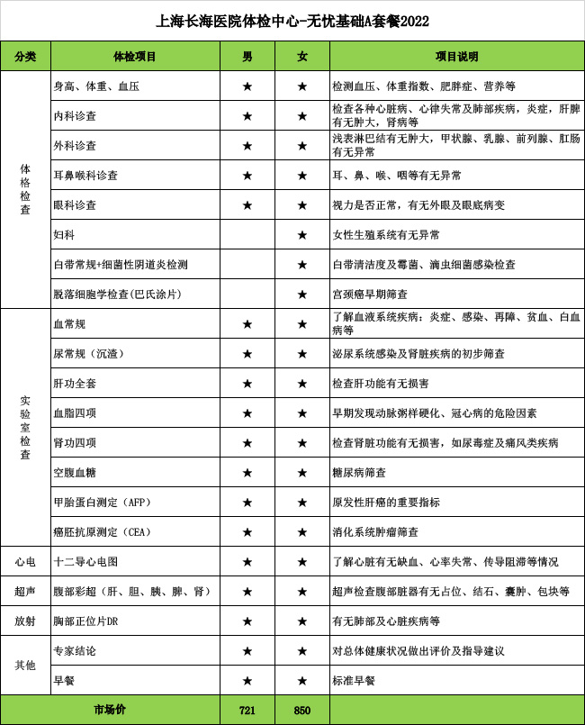 【2022】公立三甲上海长海医院体检 基础A套餐 常规体检 可加减项目 折扣预约