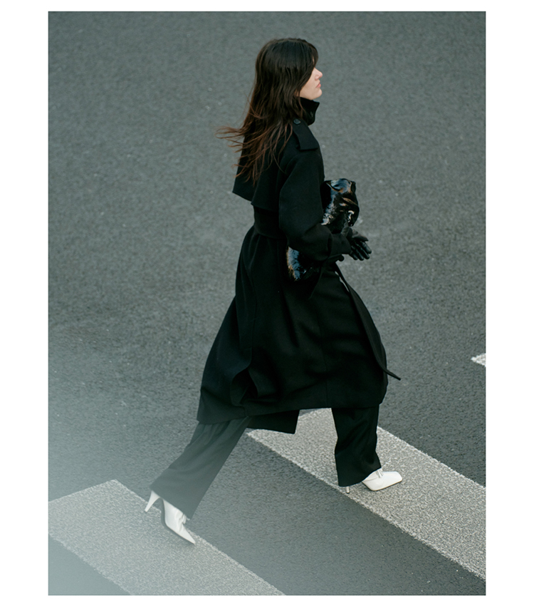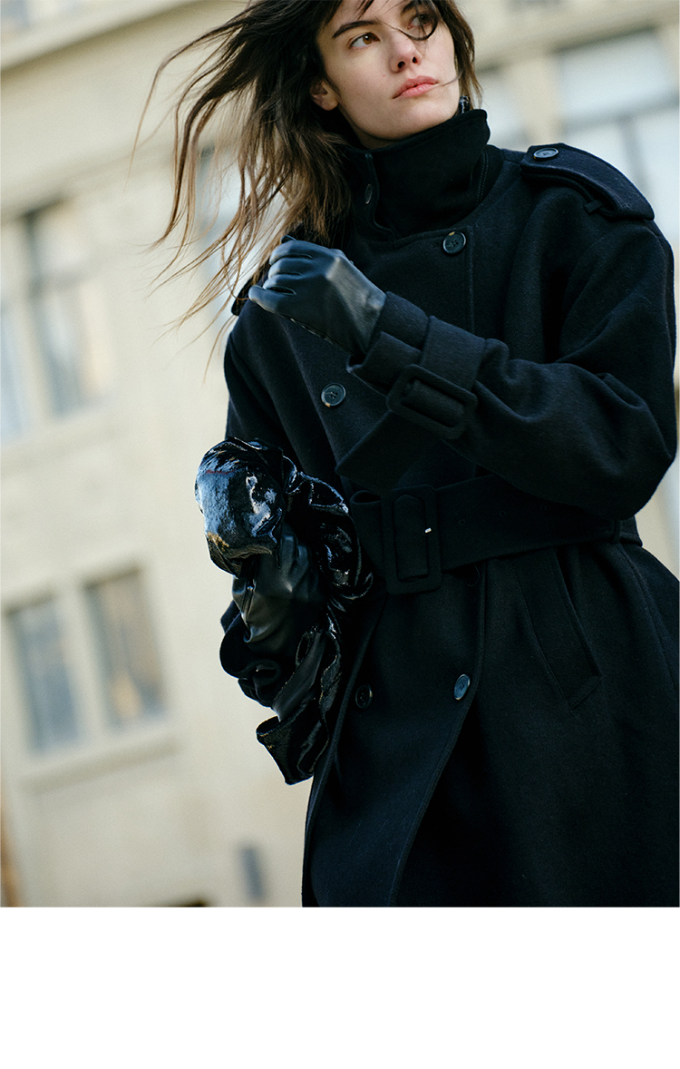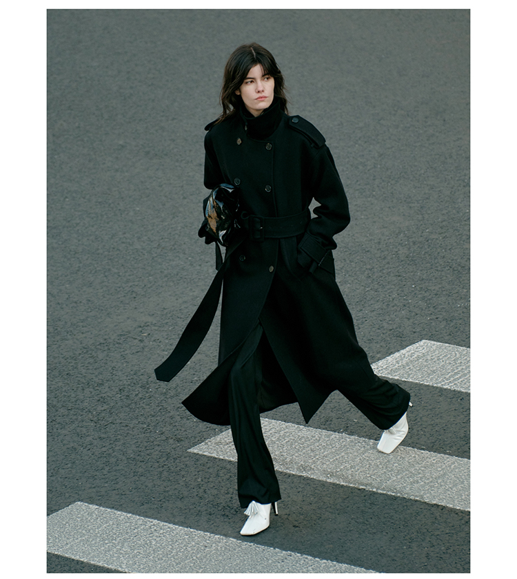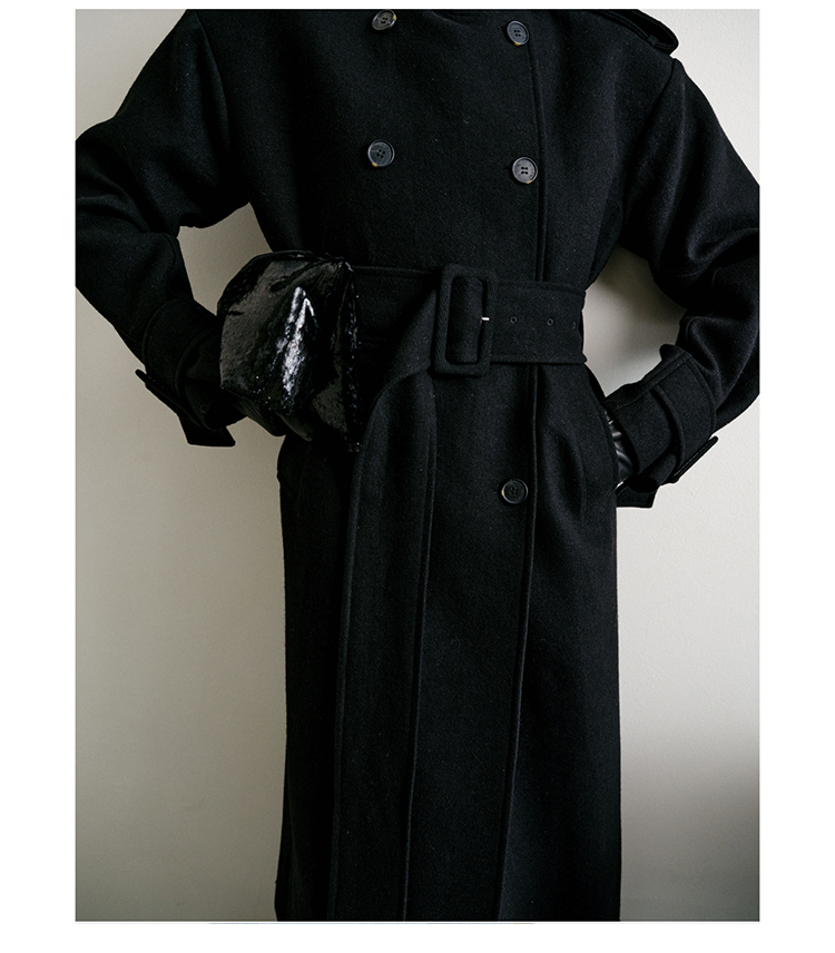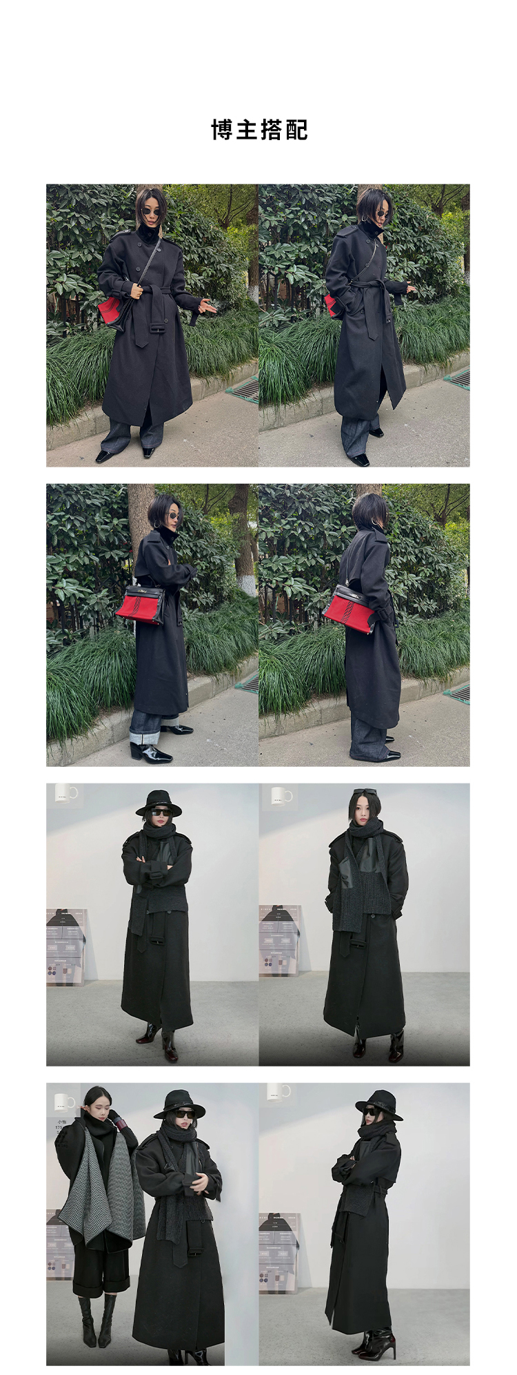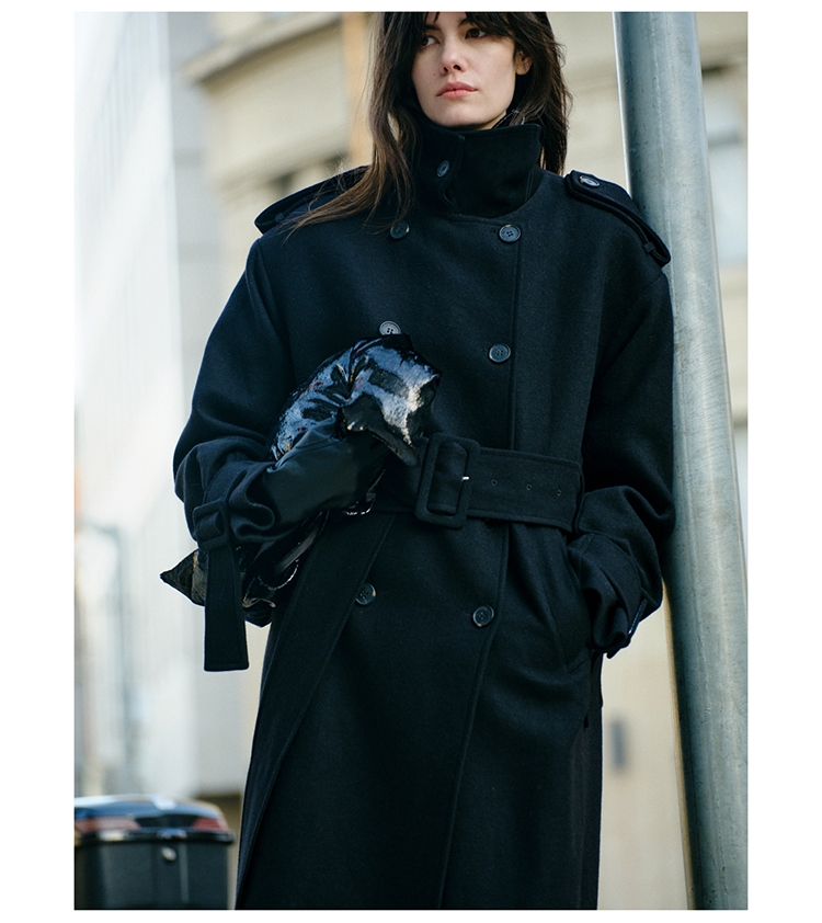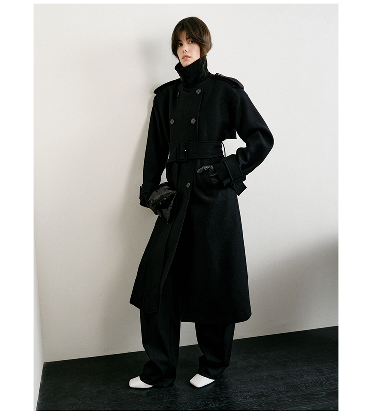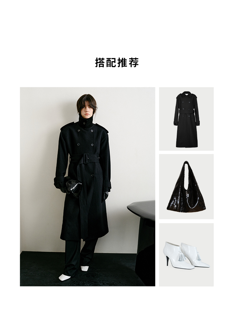 HIDEMI 节日系列进口羊麂皮拼接领极简设计感肩章宽肩大廓形可拆卸粗腰带军装感长款大衣