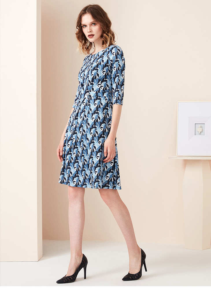 皮尔卡丹女装春季新款蓝色碎花连衣裙圆领A字裙P94DL28L3