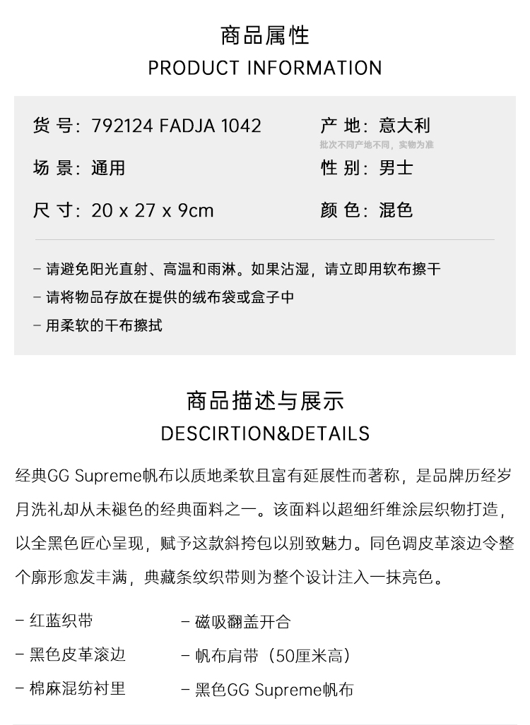 【一】GUCCI 古驰 男士 GG Supreme帆布 中号斜挎单肩包 混色 792124 FADJA 1042