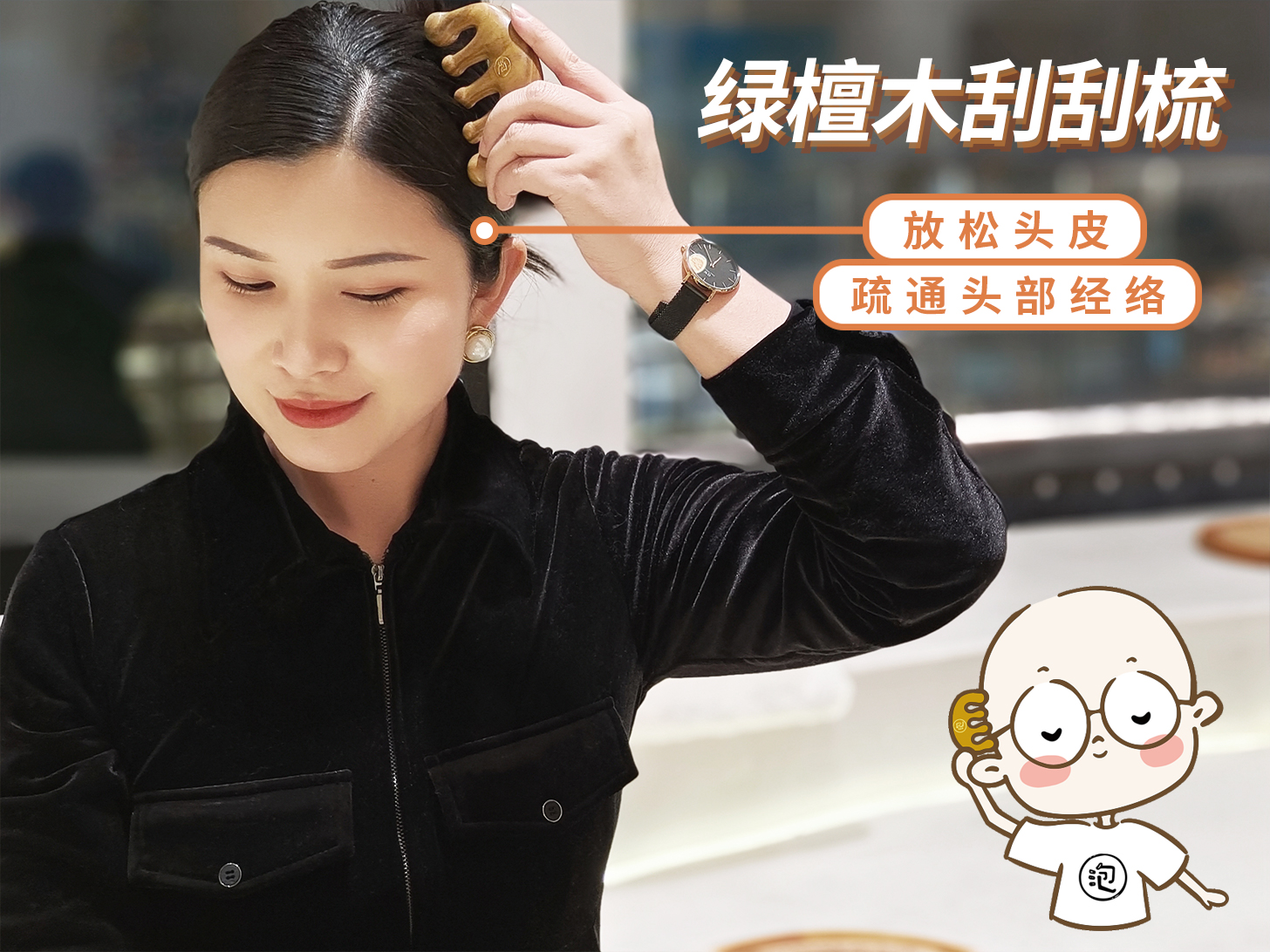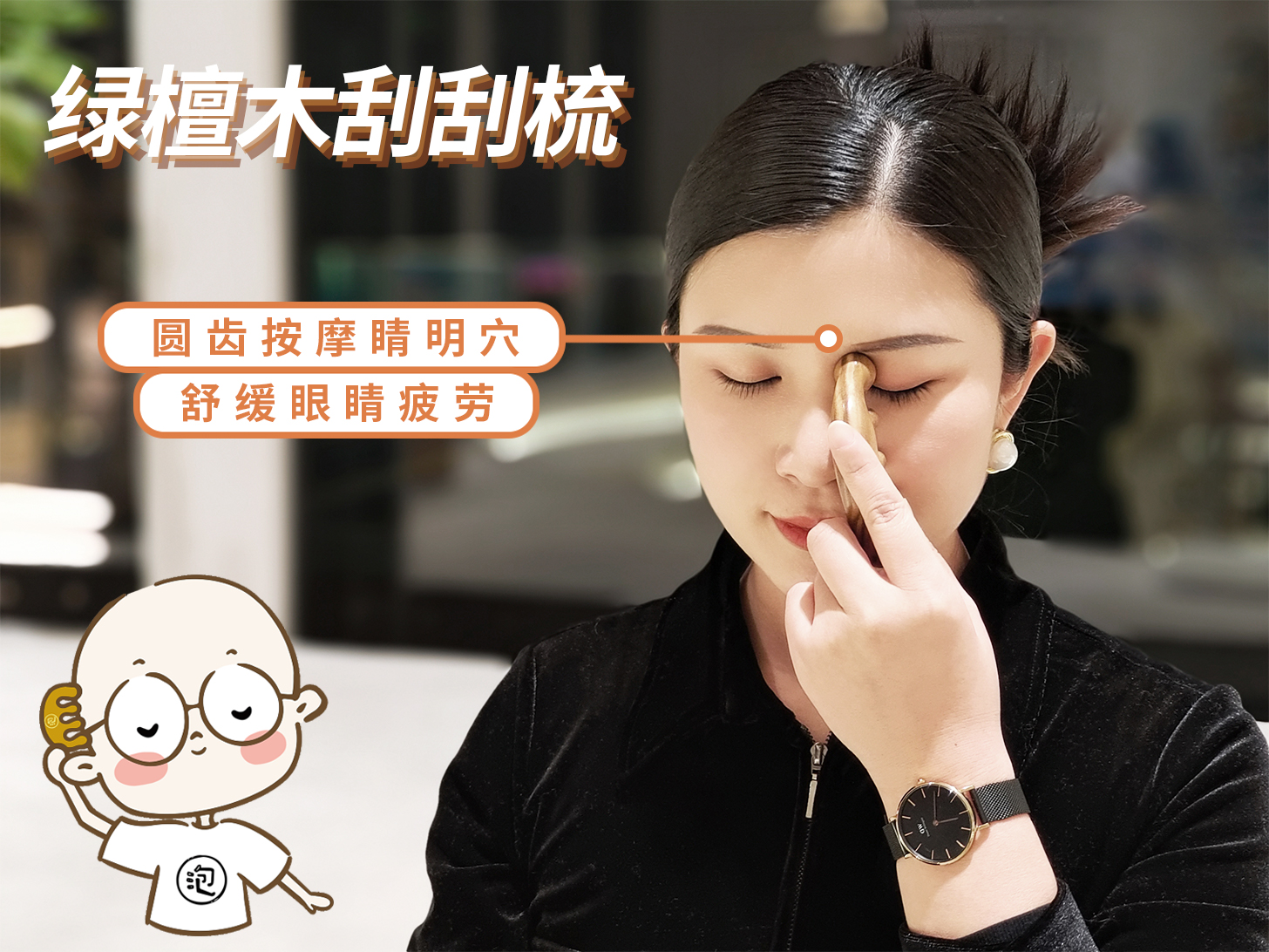 一刮头部:放松头皮。平时工作难免疲劳紧张,建议用绿檀木刮刮梳在头皮按摩一下,解压解乏,还有助于减少掉发!
