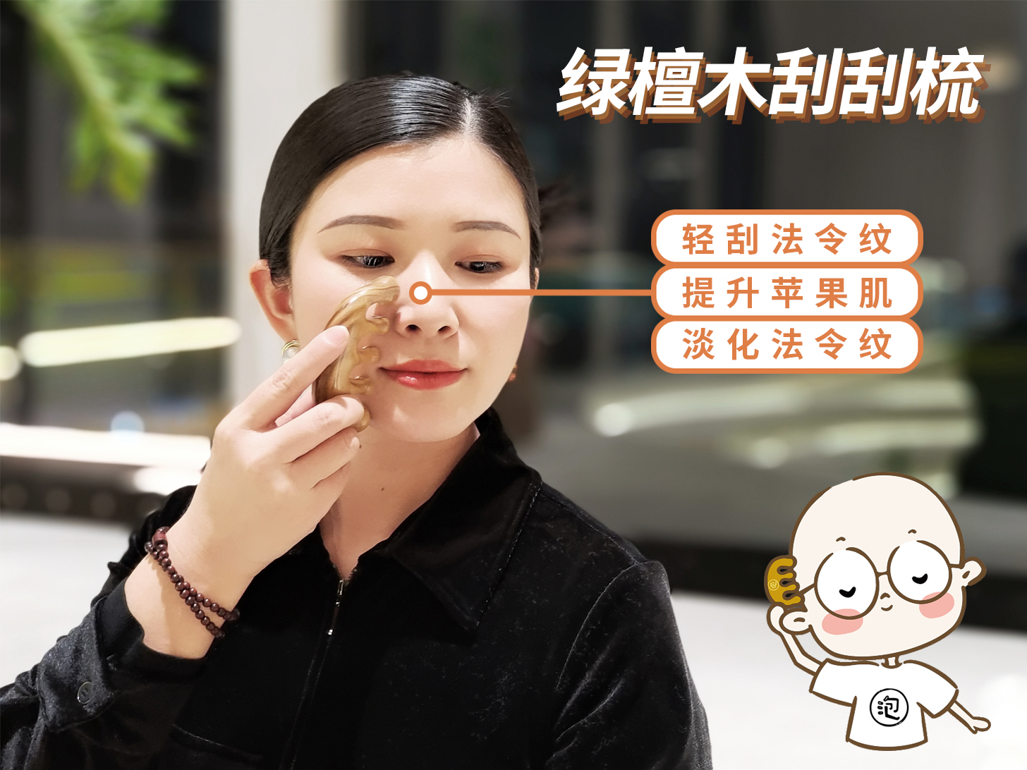 二刮面部:紧致脸庞。用绿檀木刮刮梳贴近下颌,从下巴到耳后,向上提拉,有助于紧致脸部皮肤,效果胜过去十次美容院!