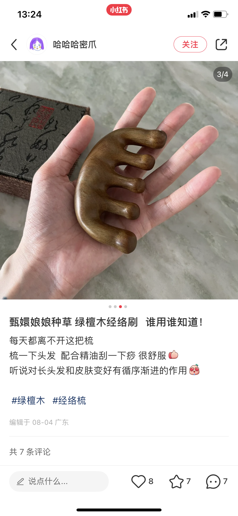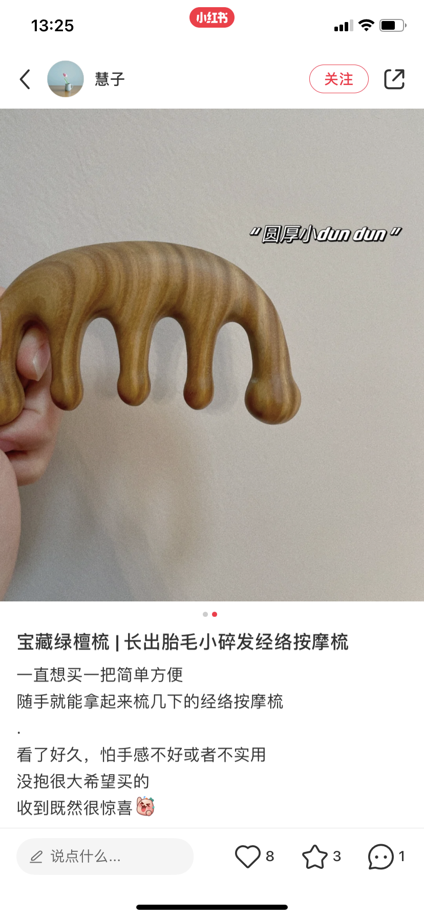 梳子的味道也好闻,有一种浑厚且古韵的木香味,忍不住想闻。大小也正正好,可以随身带着,不时的拿出来梳梳头,按按肩颈。