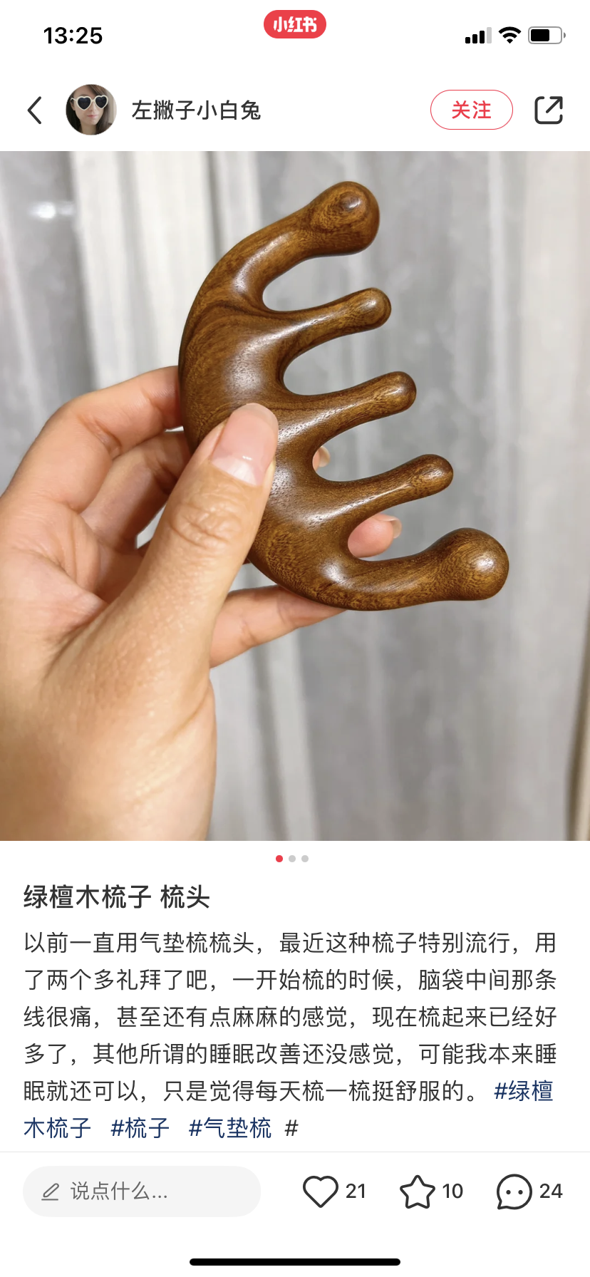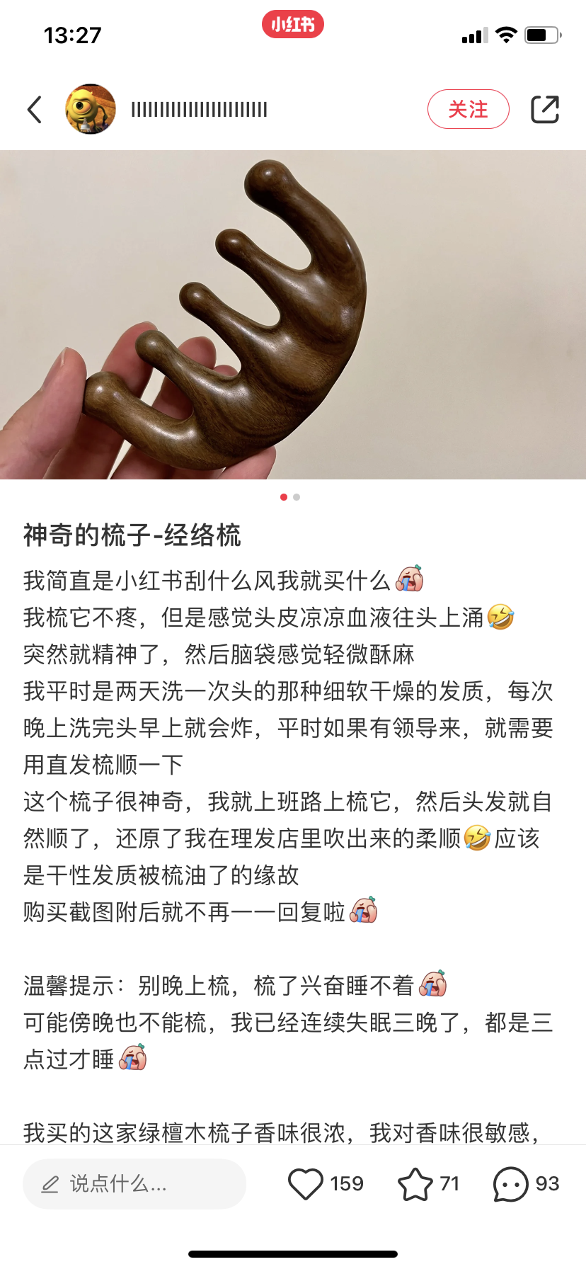 上一款晚安小灯泡的绿檀木刮刮梳,去年上过她们家好几款眼罩,很好用,她们家的养生小产品都做的很精致,我自用过很多,这个小梳子就是其中之一,很推荐大家用用。用这把梳子梳梳头皮,敲敲穴位,活络活络颈肩,很舒服。
