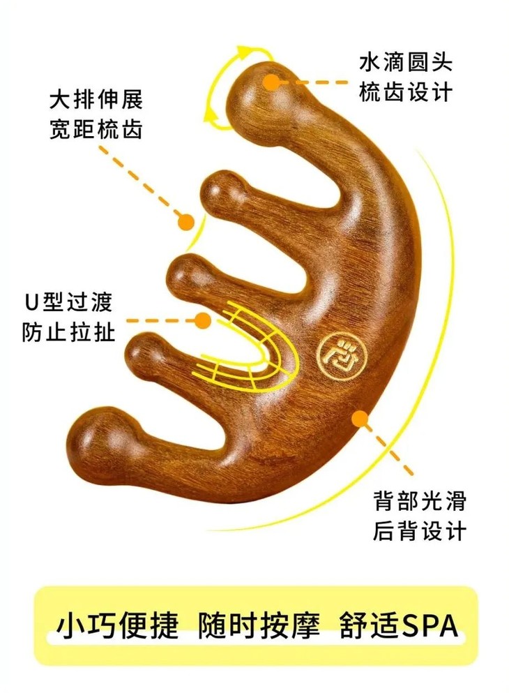 绿檀木刮刮梳采用五爪宽齿设计,梳齿圆润饱满,方便按压到位,这个这种梳子主要是按摩头皮的,促进头皮的血液循环,提供更多的氧气和血液给头发毛发,使其正常的代谢。头部存在很多穴位,经常梳头按摩头皮,一定程度上可以缓解疲劳,缓解神经紧张,并且预防头痛。