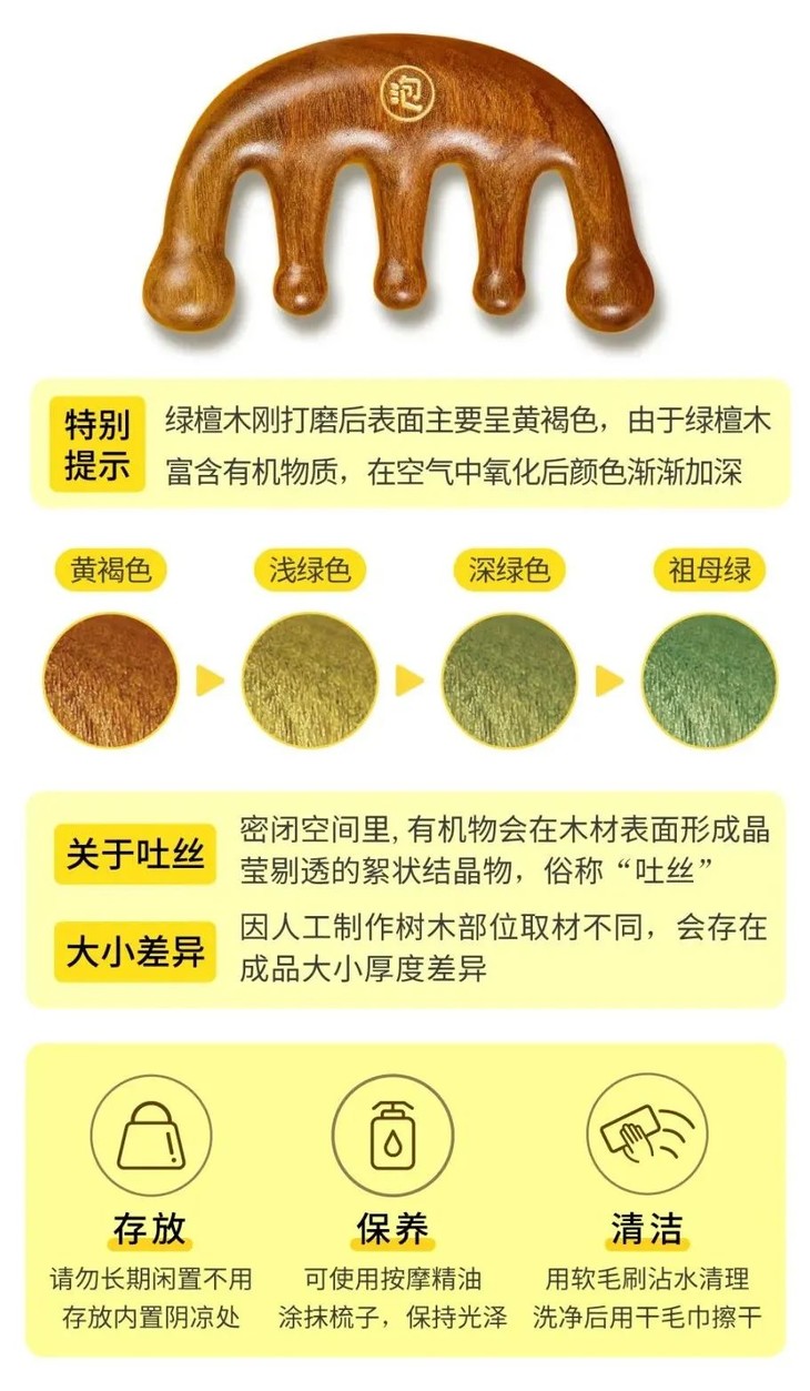 另外要注意:绿檀木梳保养时要用软的棉布擦拭,会越擦越亮、越光滑,或者可以用护理油擦拭搓揉直至吸收。不要用水泡,避免阳光暴晒,若长期暴晒,将会开裂、变形。