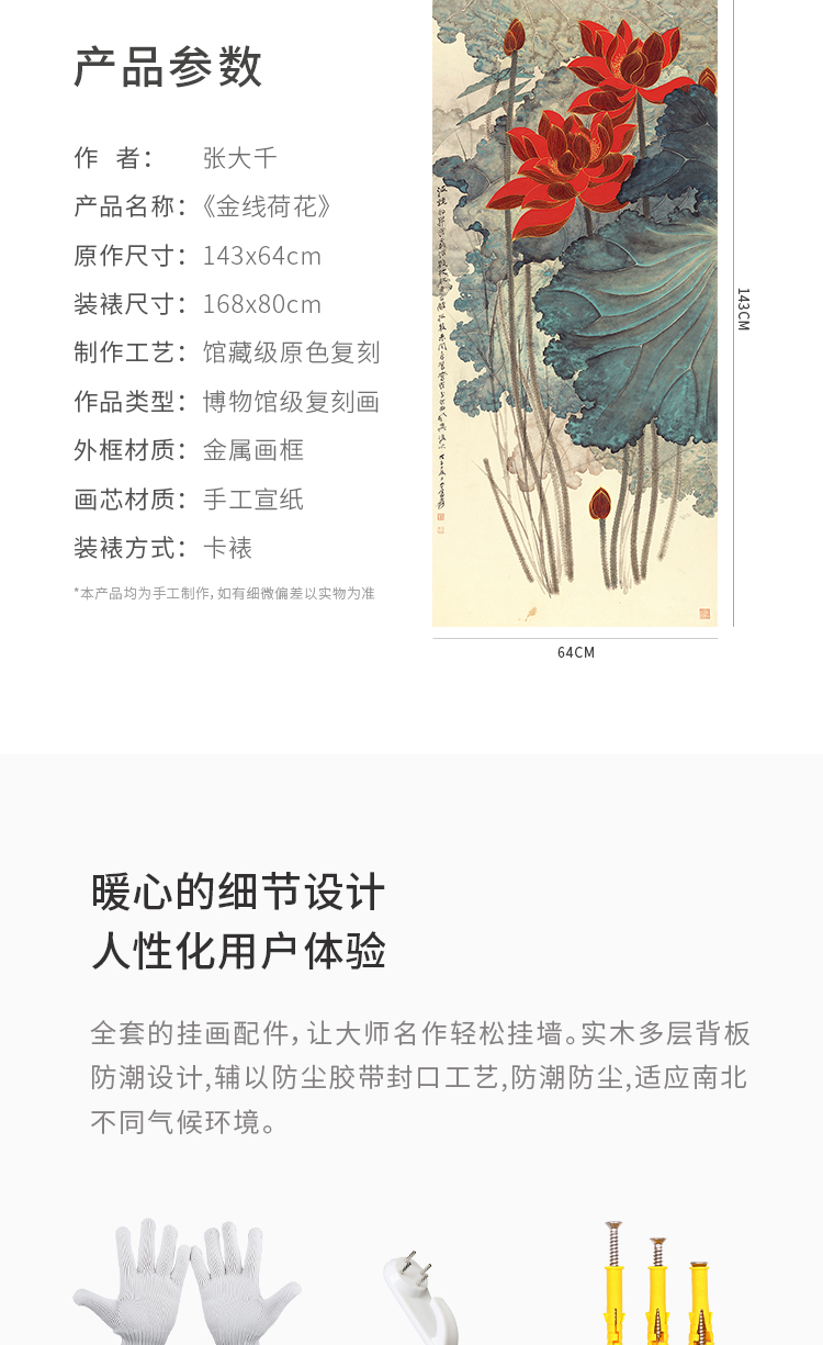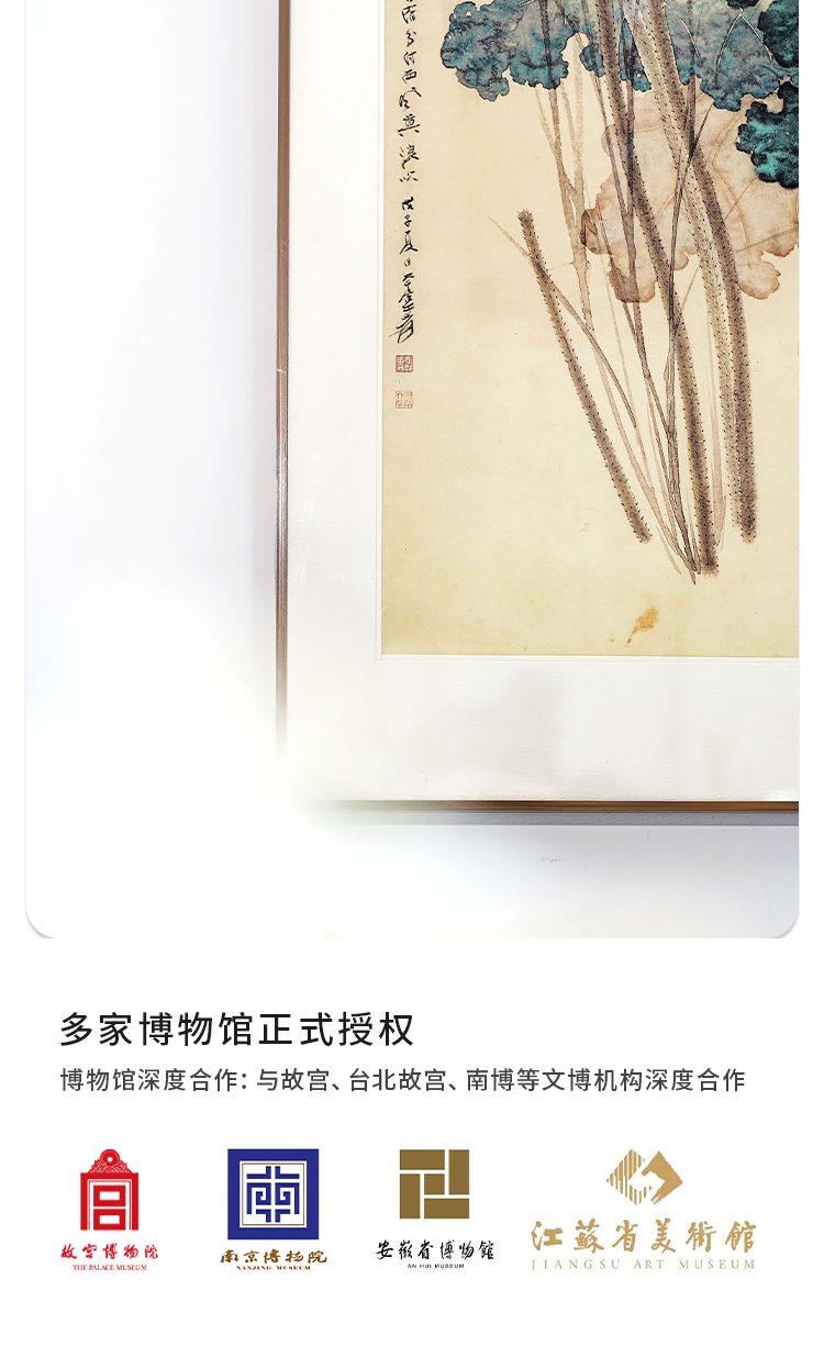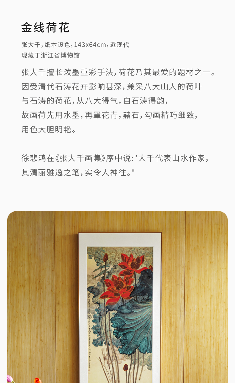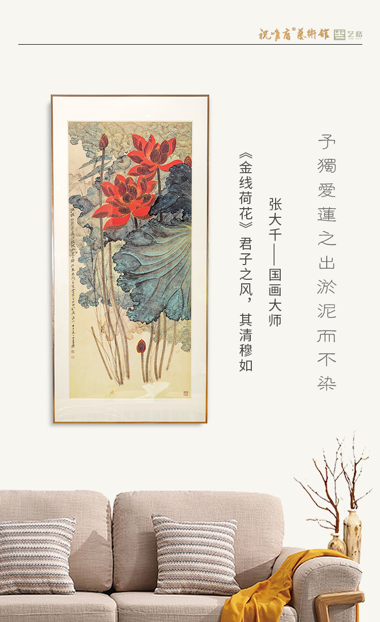 张大千《金线荷花》 博物馆原版复刻画 精品金属卡纸框(付款后15天发货)