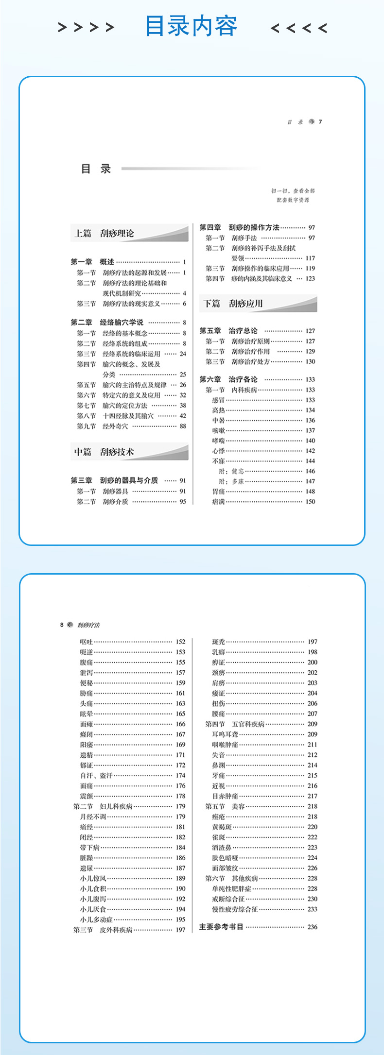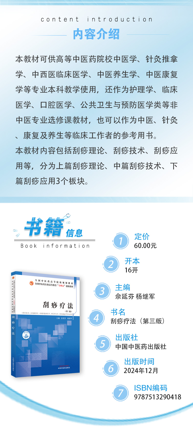 本教材内容包括刮痧理论、刮痧技术、刮痧应用等,分为上篇刮痧理论、中篇刮痧技术、下篇刮痧应用3个板块。