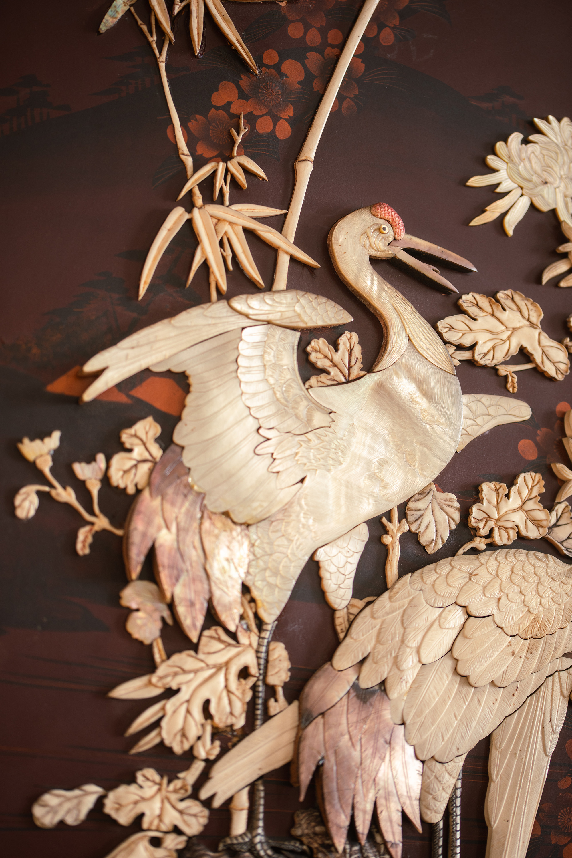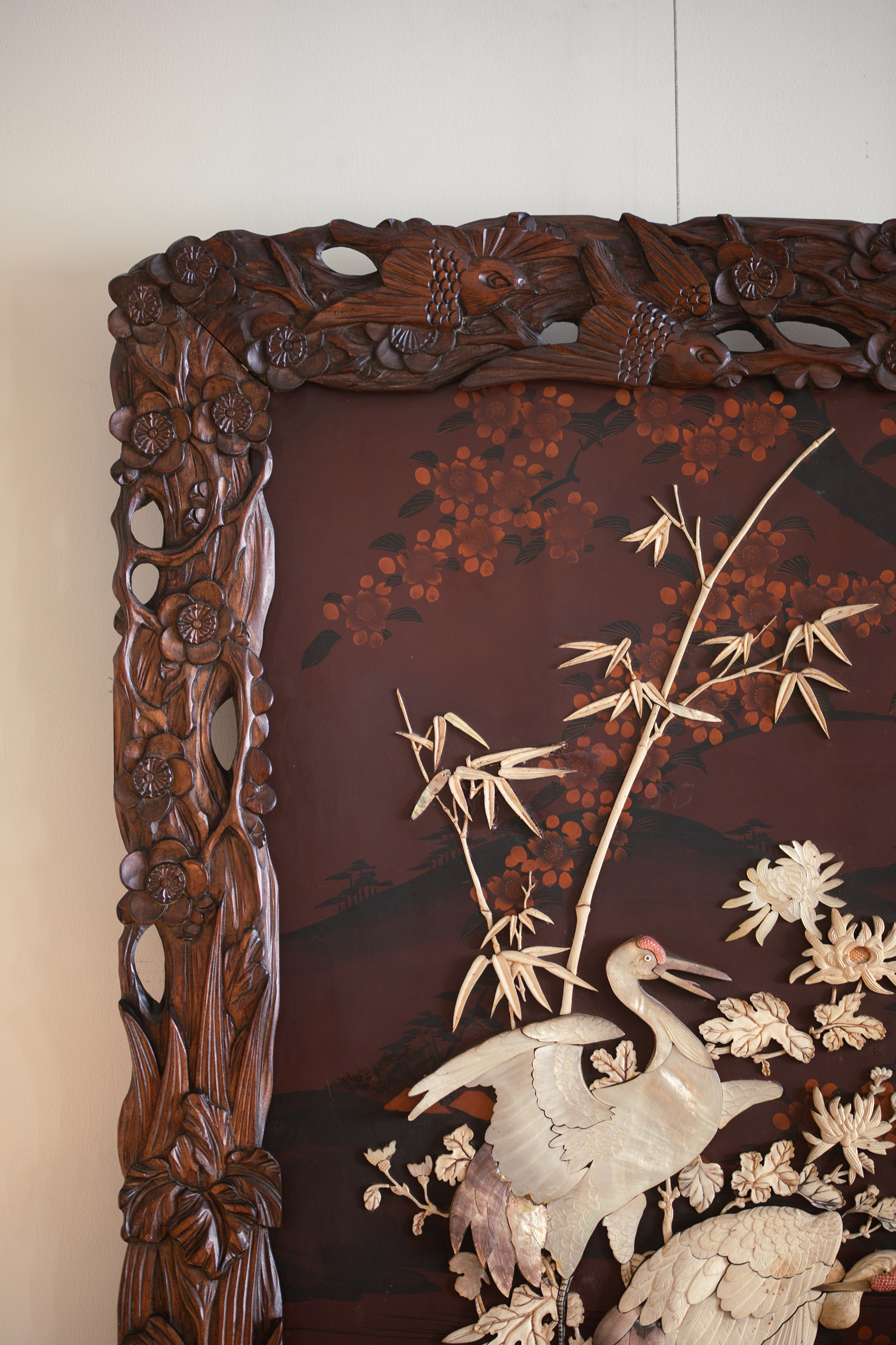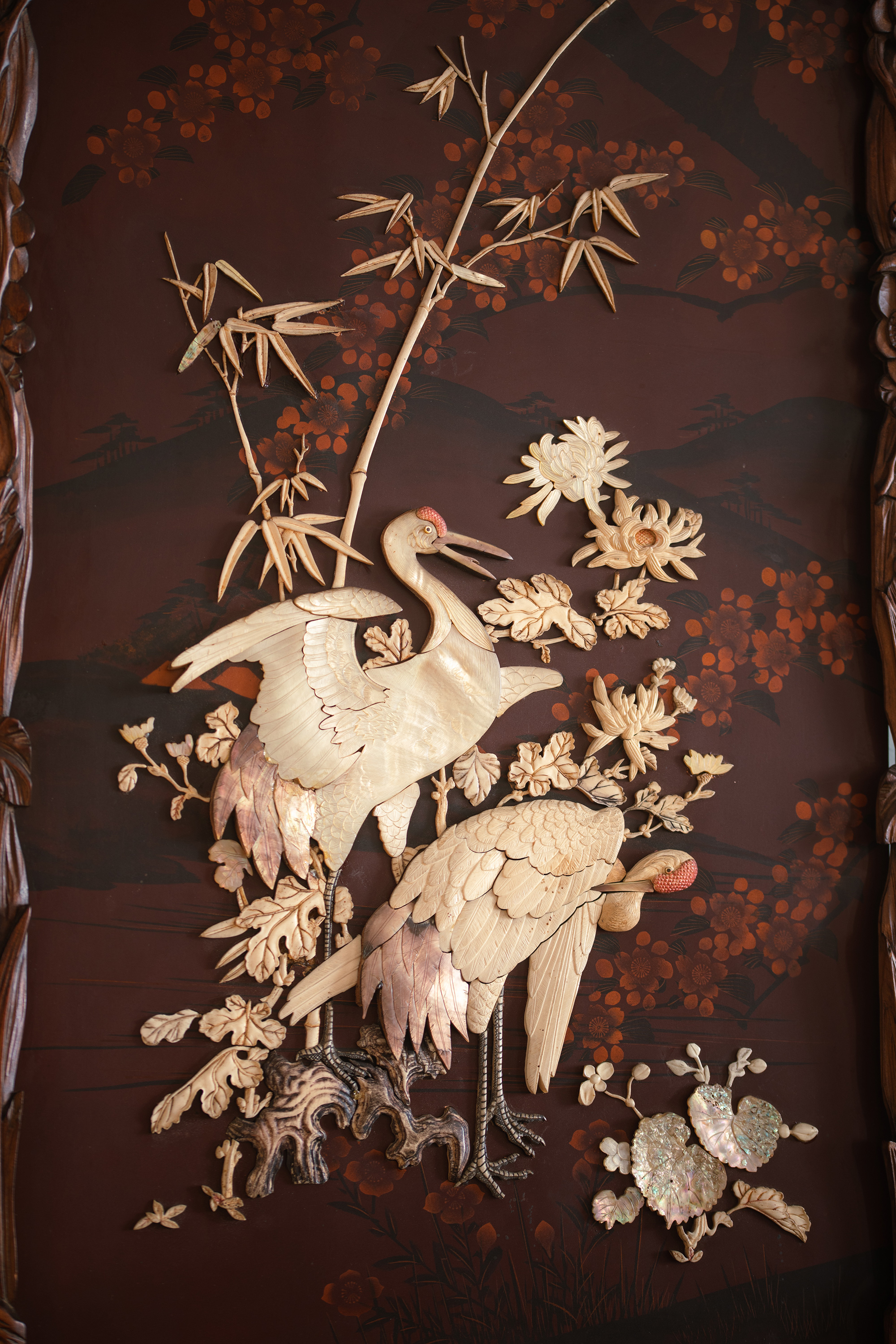 【已售】独角鹿西洋古董19世纪末20世纪初日本明治时期出品繁花飞鸟纹木雕边框嵌红漆地竹菊鹤群主题芝山镶嵌挂屏一对