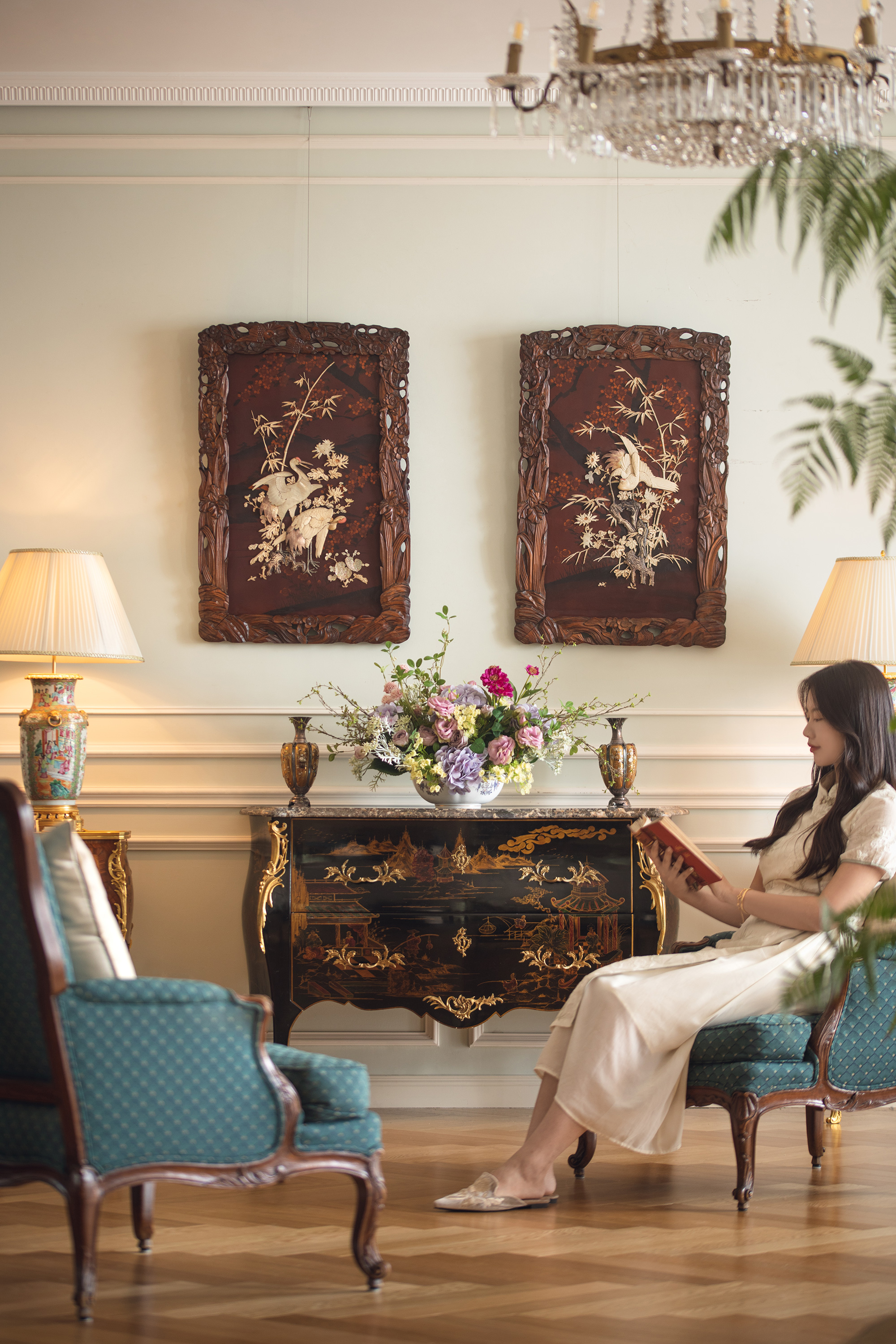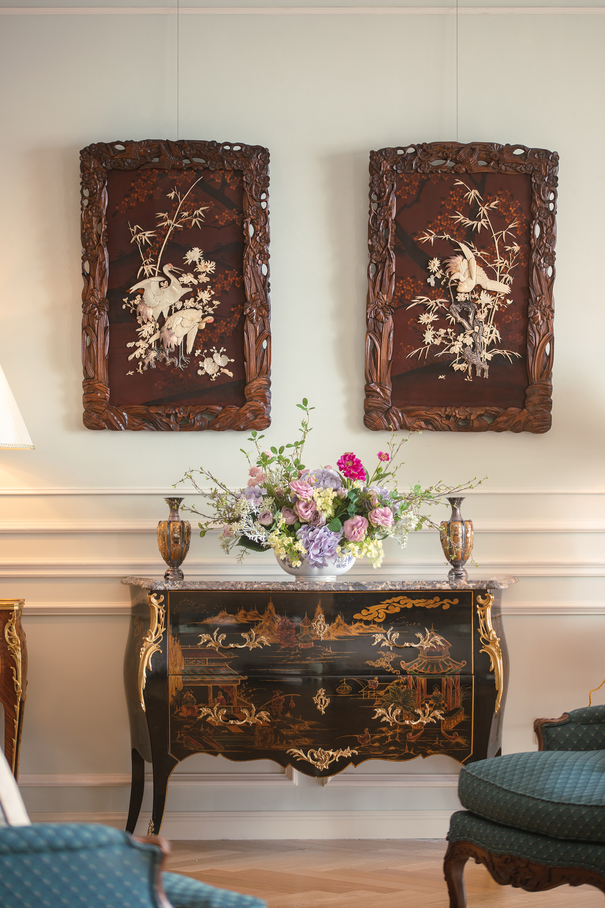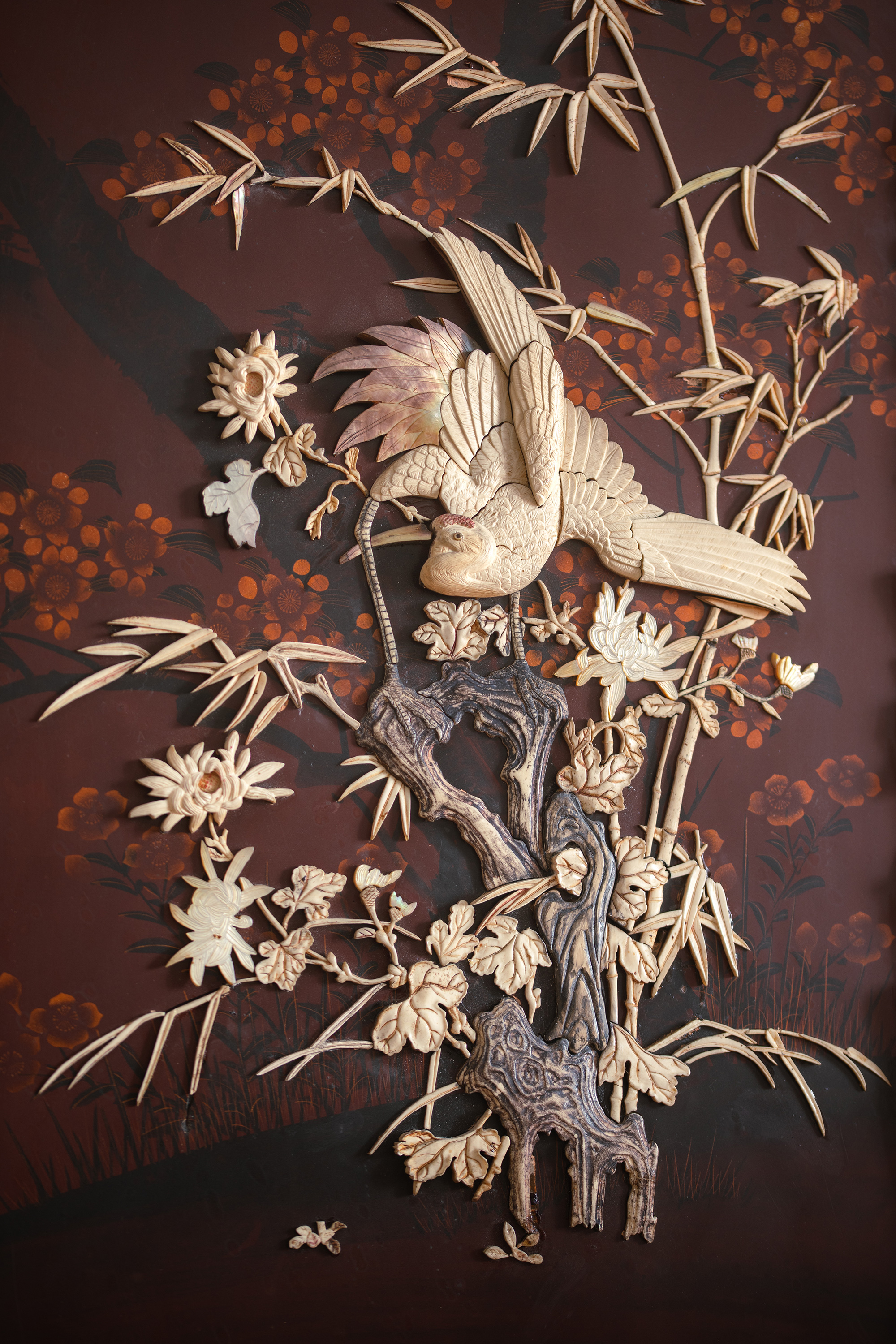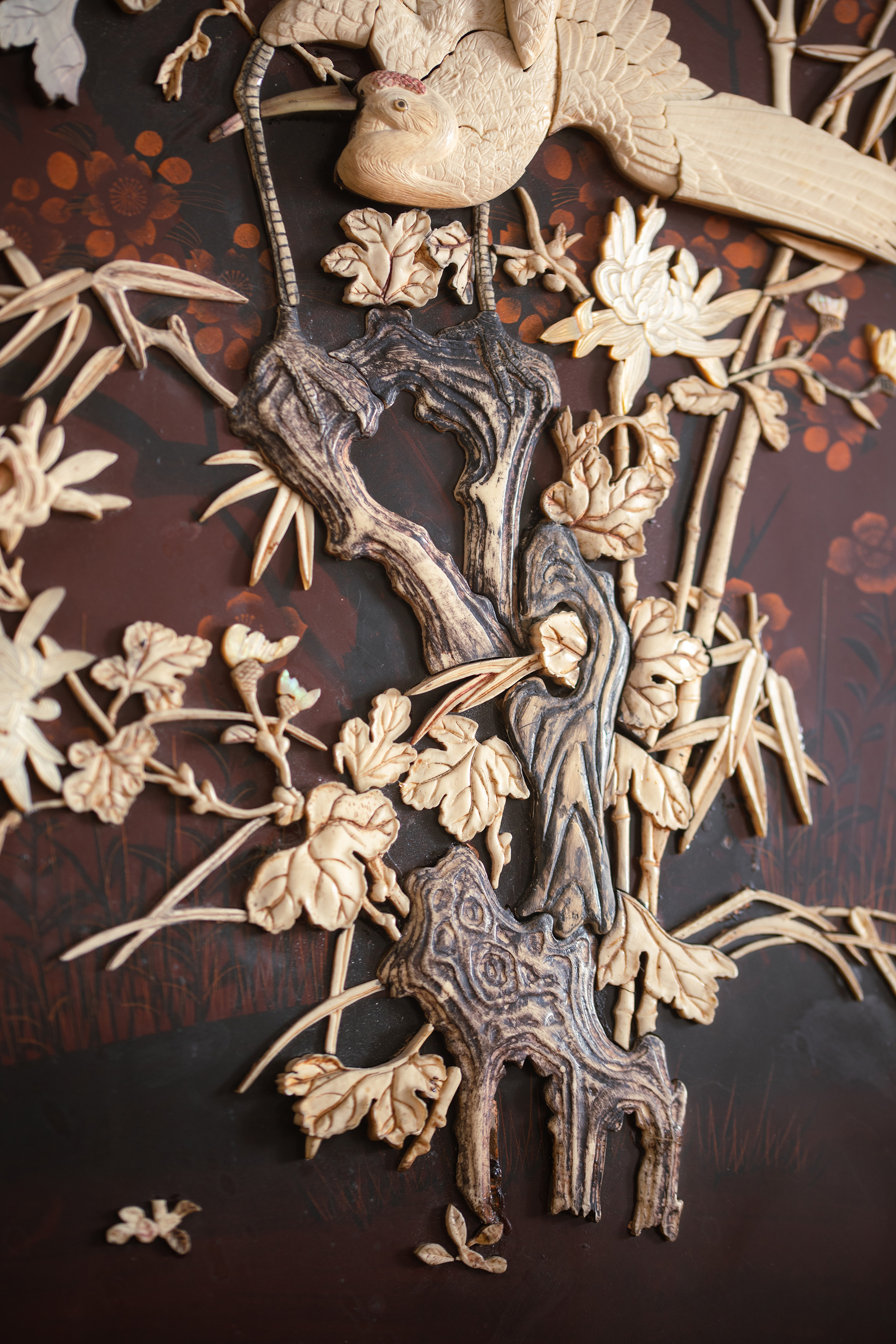 【已售】独角鹿西洋古董19世纪末20世纪初日本明治时期出品繁花飞鸟纹木雕边框嵌红漆地竹菊鹤群主题芝山镶嵌挂屏一对