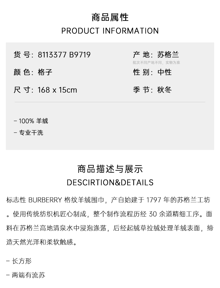 BURBERRY 巴宝莉 中性窄版格纹羊绒围巾 格子 8113377 B9719