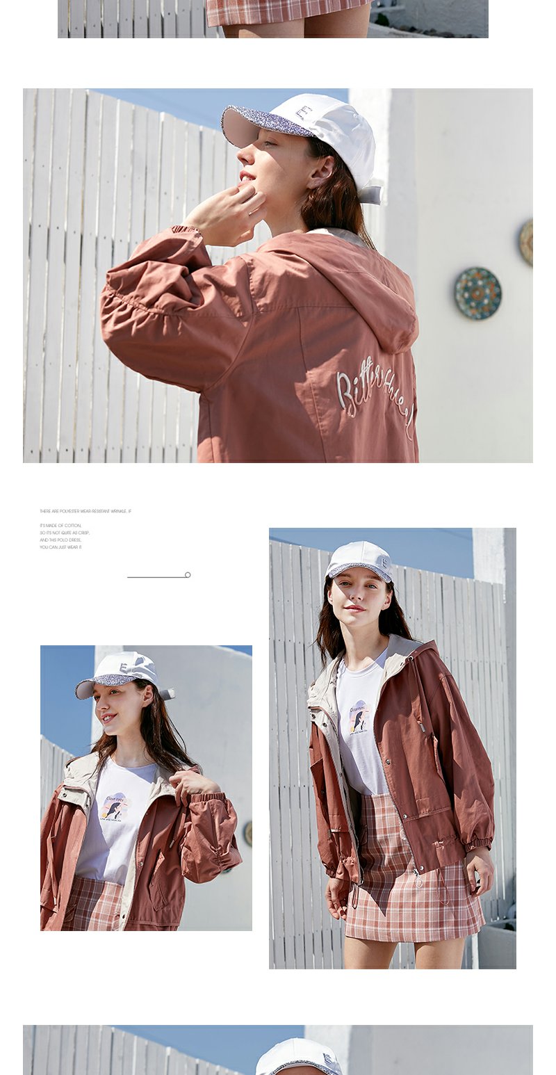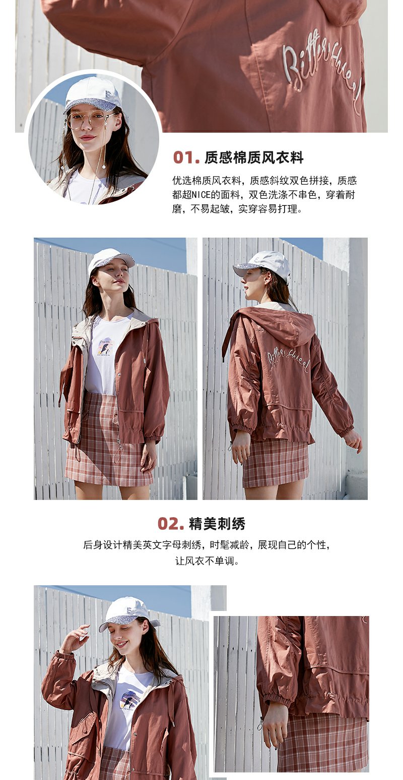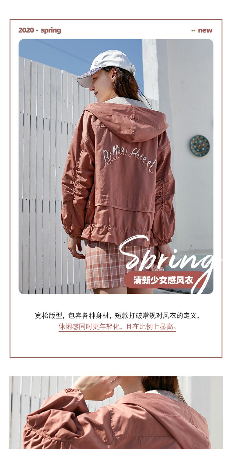 欧芮儿春新品长袖宽松短款拉链刺绣连帽风衣女工风外套
