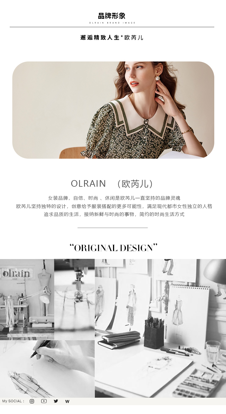 “精致”是欧芮儿olrain品牌文化的核心,欧芮儿认为,精致的女人,不但要外在动人,更要内在迷人,内外兼修,有魅力、有气质、有内涵,自信而不自傲,优雅而不矫揉,自有万种风情而不轻浮,更不故作矜持。