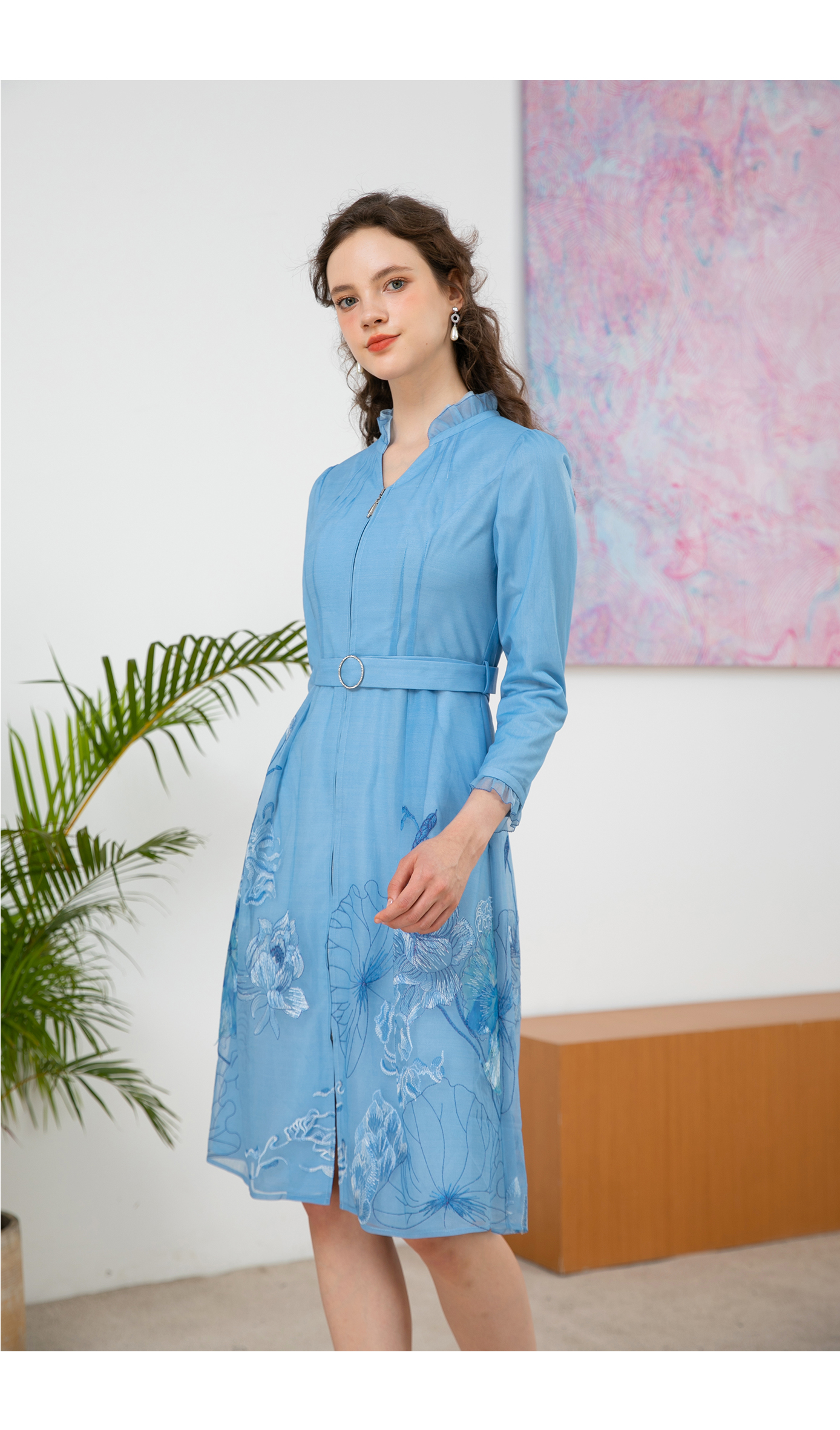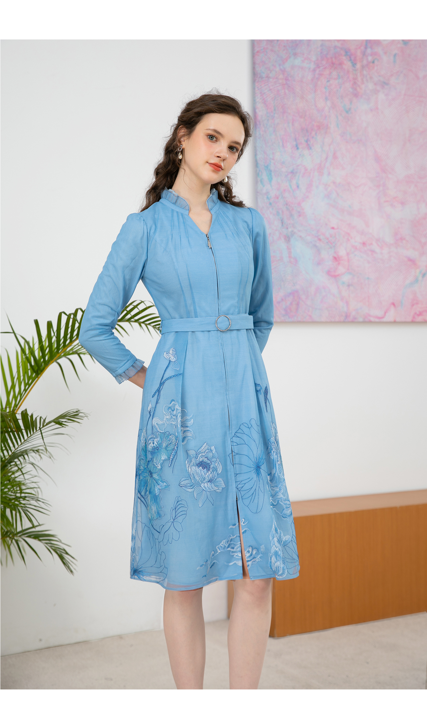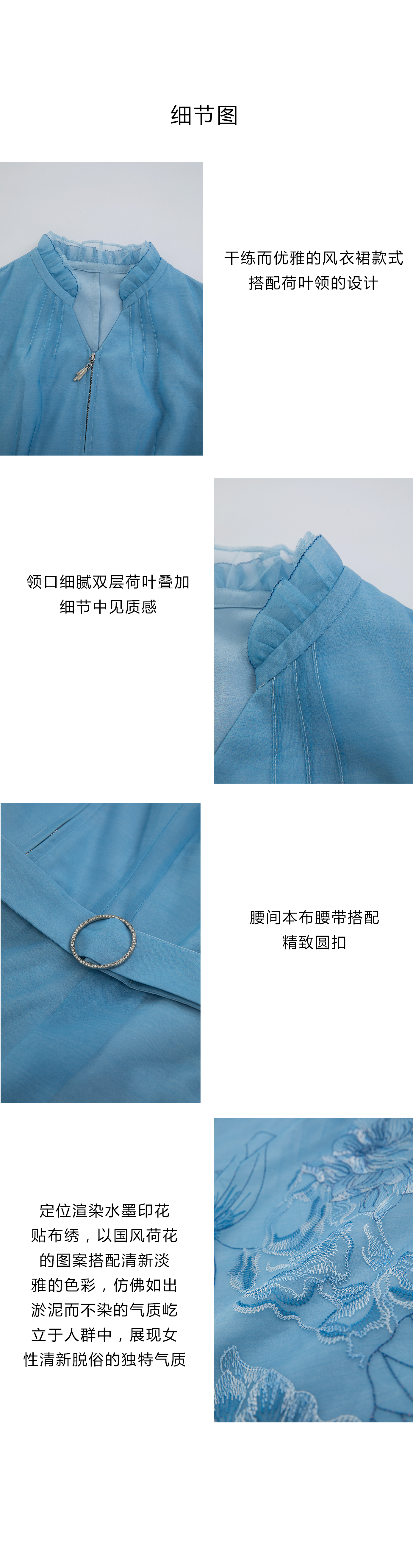 司歌刺绣弹力七分袖拉链风衣裙R901007X