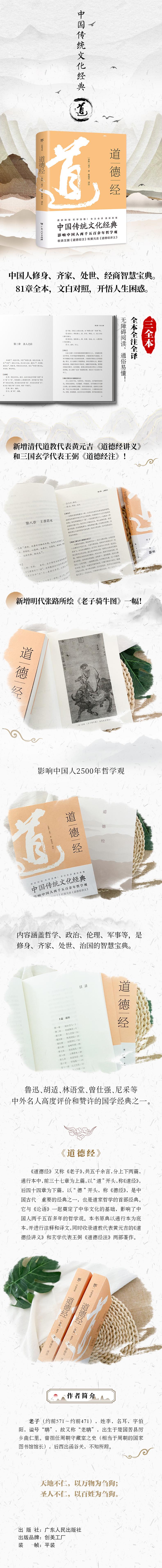 《道德经》又称《老子》,共五千余言,分上下两篇,通行本中,前三十七章为上篇,以“道”开头,称《道经》,后四十四章为下篇,以“德”开头,称《德经》,是中国古代最重要的经典之一,也是道家哲学的首部经典。它与《论语》一起奠定了中华文化的基础,影响了中国人两千五百多年的哲学观。本书原典以通行本为底本,并进行注释和译文,同时收录道教代表黄元吉的《道德经讲义》和玄学代表王弼《道德经注》两部著作。