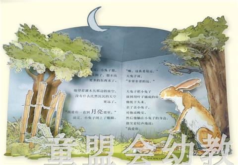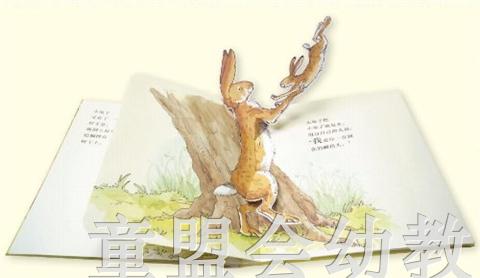 现在只要翻开《猜猜我有多爱你》立体游戏书,拉一拉、翻一翻、转一转,就能让孩子看到小兔子开得不能再开的双臂,想象小兔子的爱到底有多长?看着小兔子倒挂在半空中,看到大兔子把小兔子抛高高,小兔子跳来跳去可爱的模样,看到小兔子睡着了,大兔子低头温柔的亲吻与呵护……